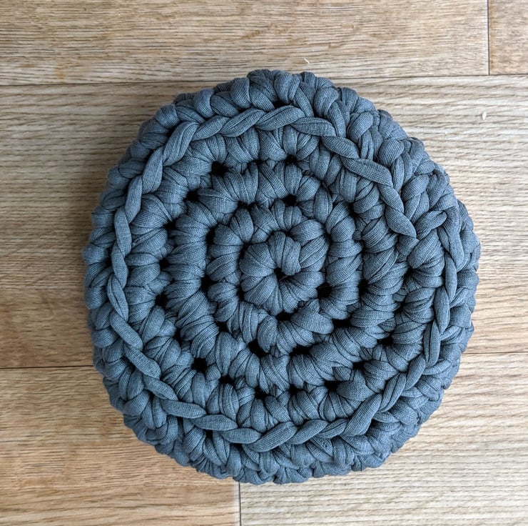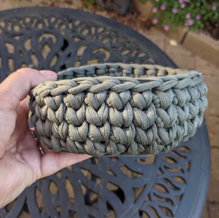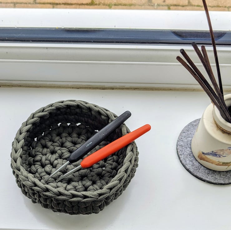 The T-shirt yarn gives great definition to the crochet stitches used to create it. I used waistcoat stitch for the side of this bowl which takes longer to do but gives a different pattern and looks like knitting. It makes the bowl extra sturdy so that it keeps its shape well.