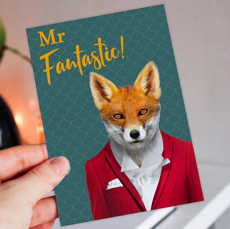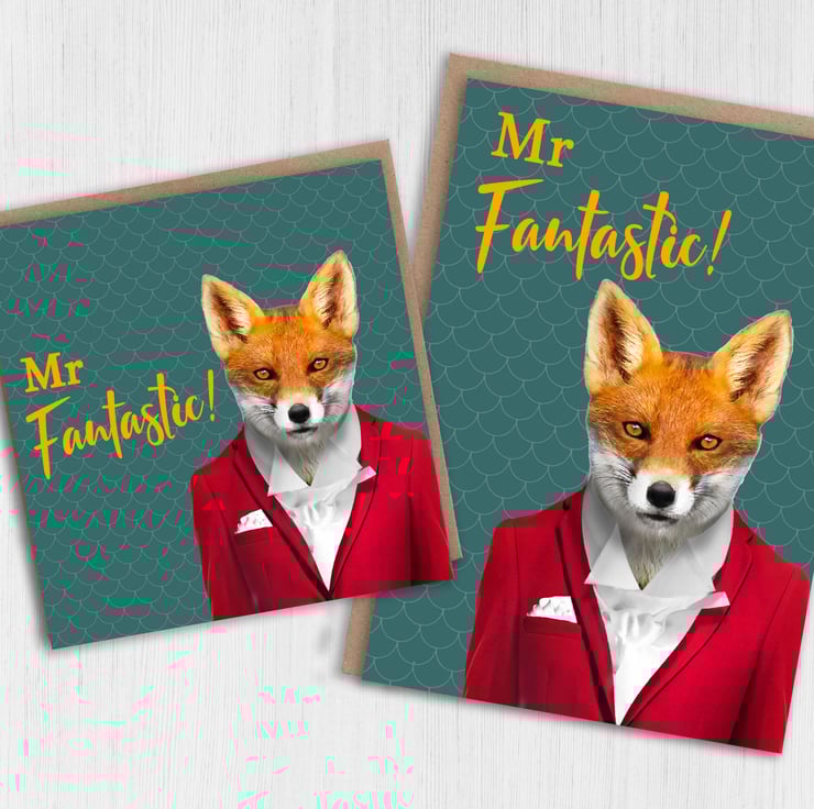 Fox in clothes anniversary card for husband, boyfriend, partner: Mr Fantastic (Animalyser) (Size A6/A5/A4/Square 6x6")