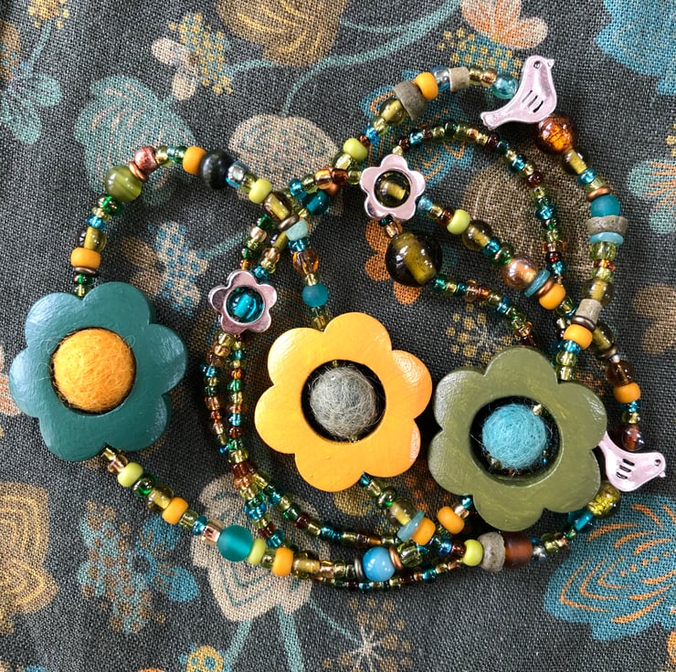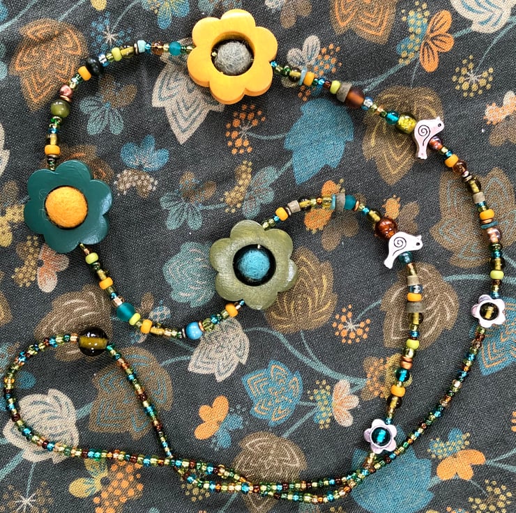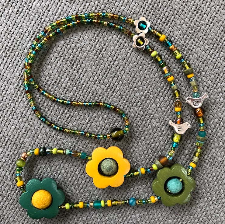 A beautiful, bold and fully-beaded necklace featuring a glorious mixture in shades of olive green, mustard and teal. The main feature of this necklace are three hand painted wooden flowers with contrasting felt balls at their centres. Two little antique silver tone birds perch above them and there are two little antique silver tone daisies with coloured glass beads for their centres. The rest of the necklace comprises tiny foil glass and recycled glass beads with a handful of wooden beads thrown into the mix and a larger wooden bead at the back of the neck concealing the knot in the waxed linen thread on which the necklace is strung.