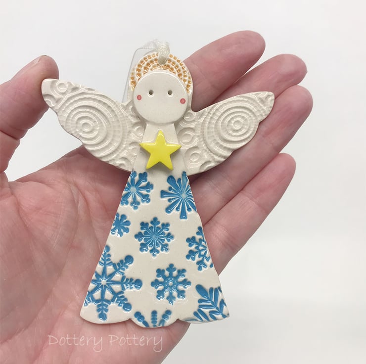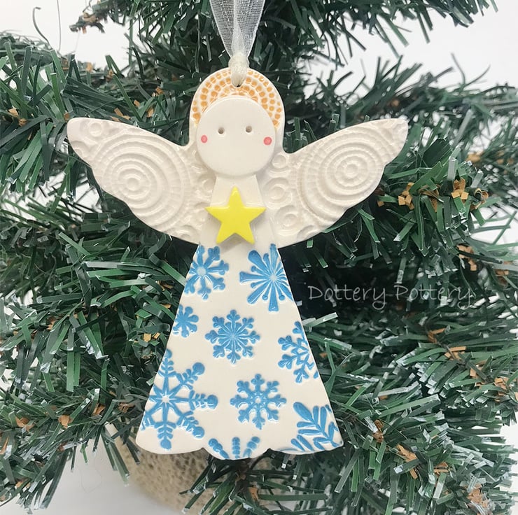 This cute little angel is made from white earthenware clay and decorated with a blue snowflake pattern. It has been finished with a clear, glossy glaze. Fired twice. Glazed on the front only. It measures 8.5 cm high and 7 cm wide and hangs from a cream organza ribbon.
