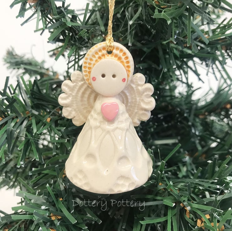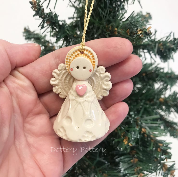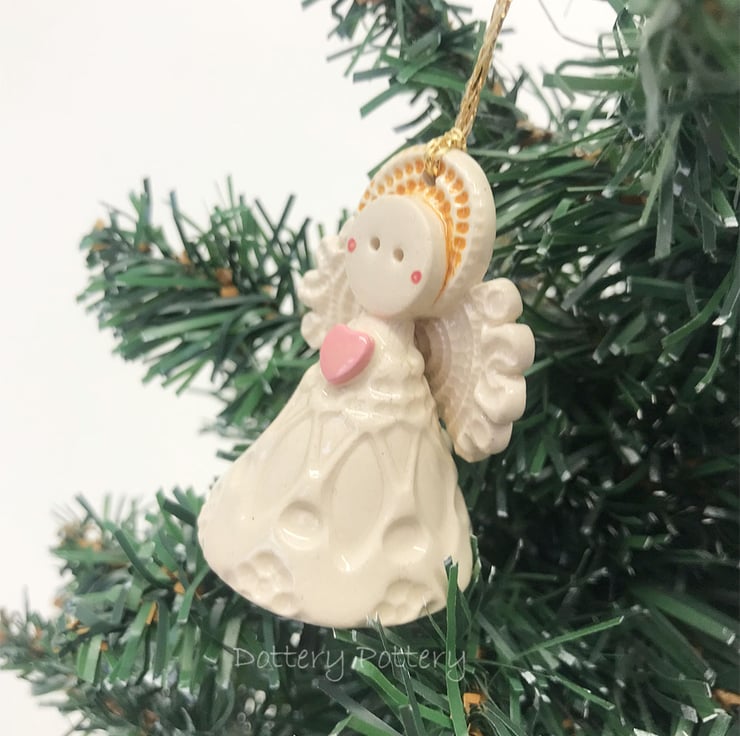 This tiny angel is made from white earthenware clay. She has a little cream dress and a cute little button detail at the back. She can hang from the Christmas tree or be a free standing ornament. She measures 5cm high x 4cm wide She's a little bit too wide to fit in a large letter parcel, (I blame all the mince pies!) so, she has to go as a small parcel but I hope you think she's worth the little bit of extra postage cost.