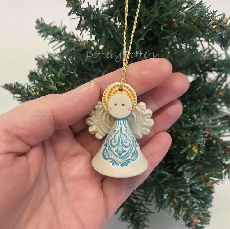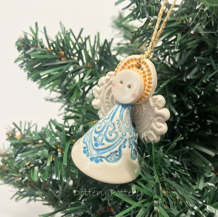 This tiny angel is made from white earthenware clay. She has a little cream dress and a cute little button detail at the back. She can hang from the Christmas tree or be a free standing ornament. She measures 5cm high x 4cm wide She's a little bit too wide to fit in a large letter parcel, (I blame all the mince pies!) so, she has to go as a small parcel but I hope you think she's worth the little bit of extra postage cost.