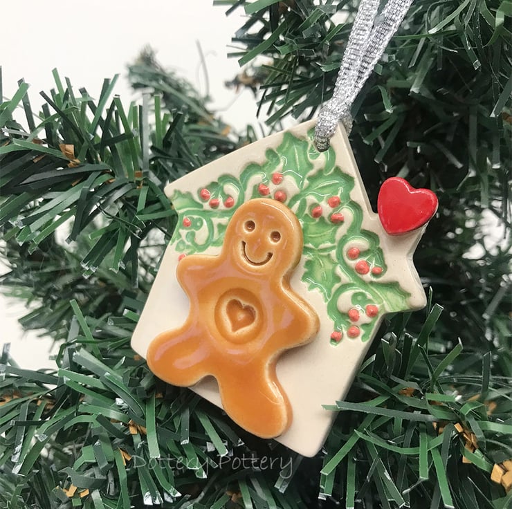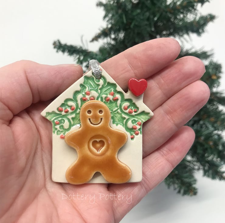 This little pottery gingerbread house decoration is made from white earthenware clay and glazed in a rich, glossy clear glaze. It has been fired twice. It measures 7.5 x 7cm and hangs from silver ribbon. Decorated on the front only. (The last photo is just to show scale - you will recieve one green house)