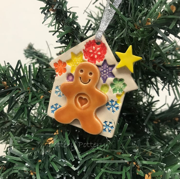 This little pottery gingerbread house decoration is made from white earthenware clay and glazed in a rich, glossy clear glaze. It has been fired twice. It measures 7.5 x 7cm and hangs from silver ribbon. Decorated on the front only. (The last photo is just to show scale - you will recieve one green house)