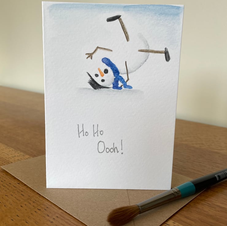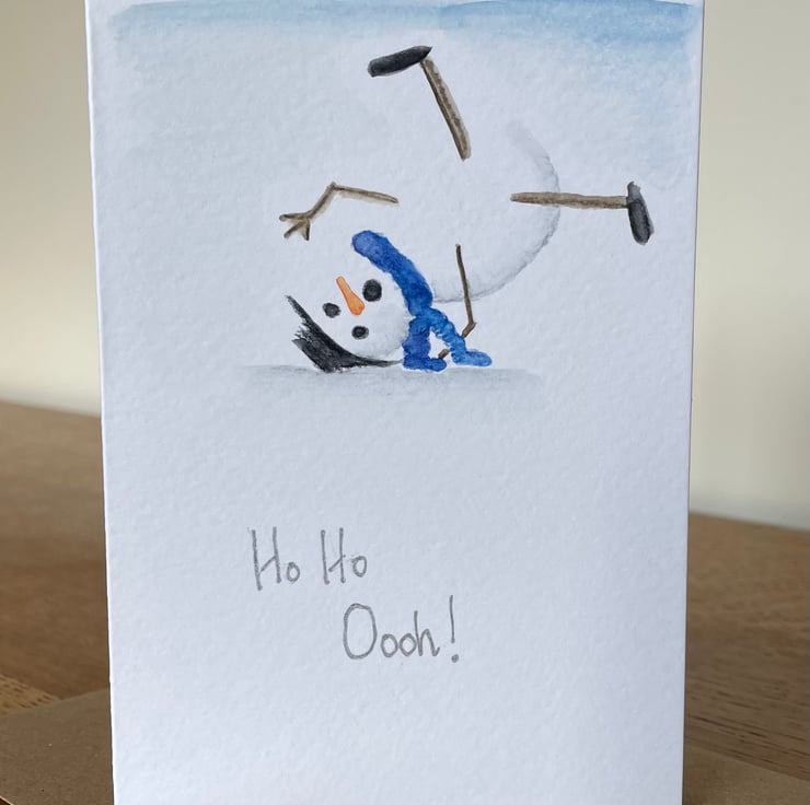 Hand painted original water colour Christmas card, a little card featuring a funny snowman and the words Ho, Ho, Oooh! written by hand in silver ink.