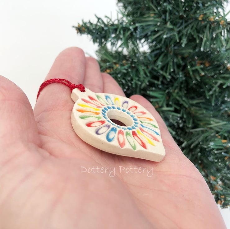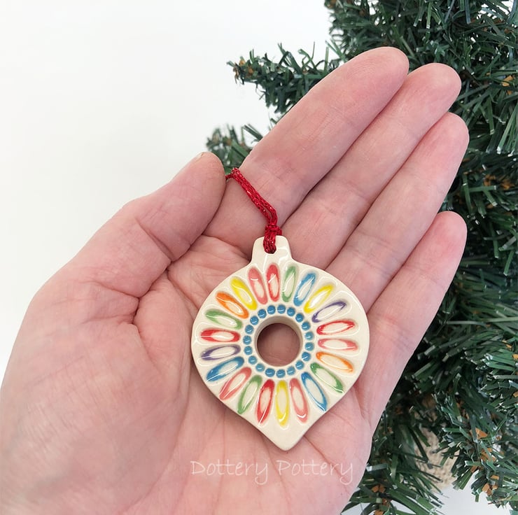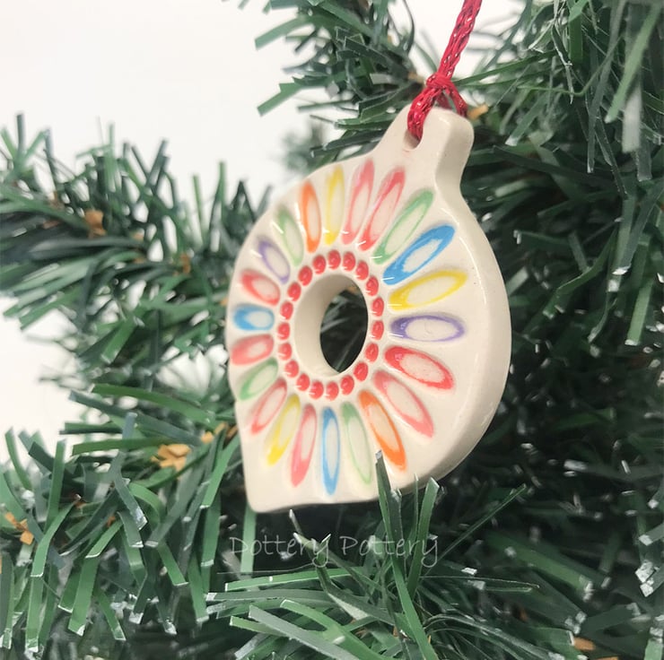 This ceramic bauble decoration has a lovely bright design in rainbow colours with a little hole in the middle. It's really cheerful! It is made from white earthenware clay and fired once, then glazed and fired again. It measures 5.5cm length and 4cm width and 0.5cm deep and hangs from a glittery red thread. The little round pattern around the hole comes in a variety of colours, so you will get one bauble chosen at random. This is for ONE bauble, the last photo is to show how it could look if you hang more than one on the tree.