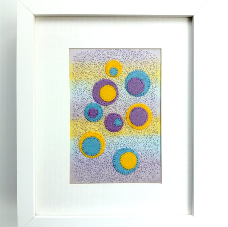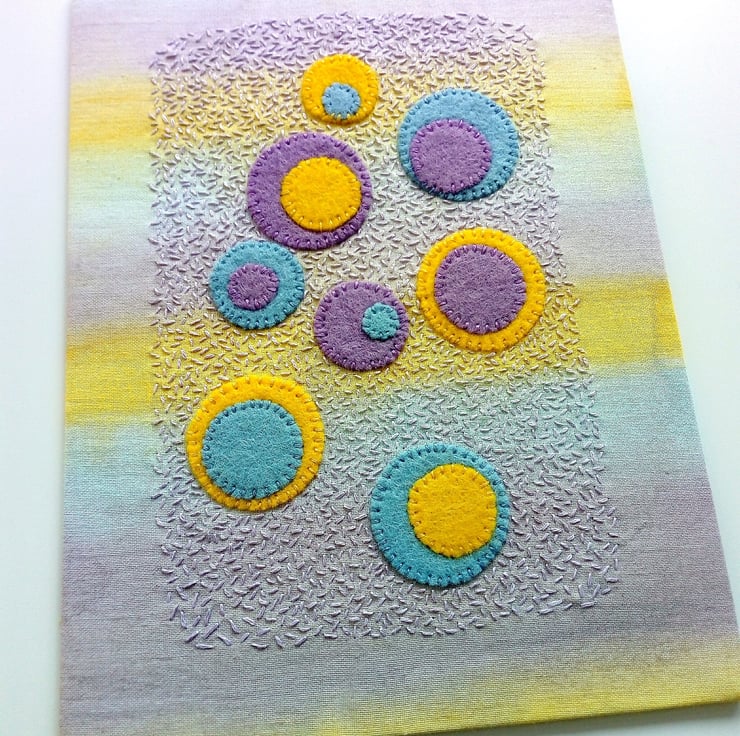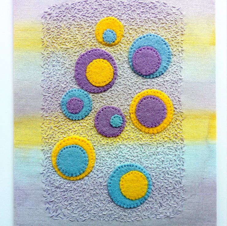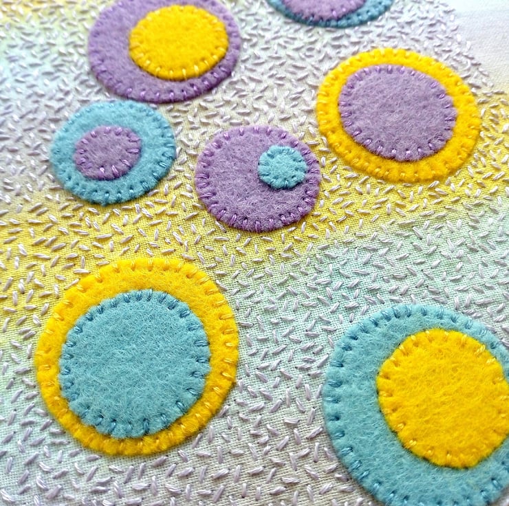 Firstly, fabric was painted using a mix of yellow, purple and blue to give a blended background effect. Felt circles were then hand cut to different sizes in the same colours and stitched to the fabric, with each circle having another smaller stitched circle within it.