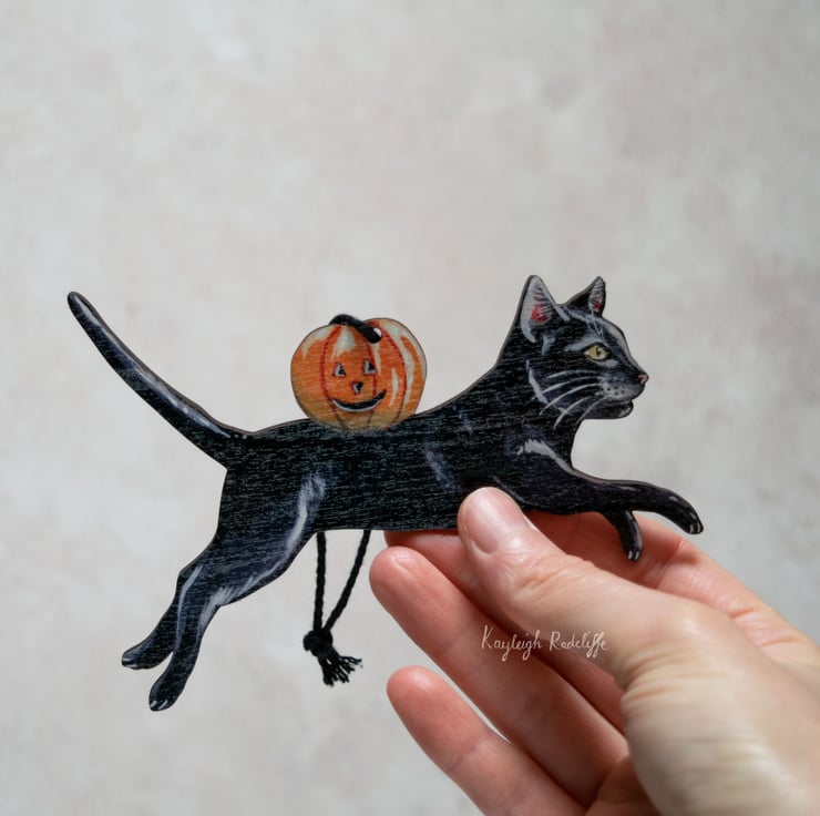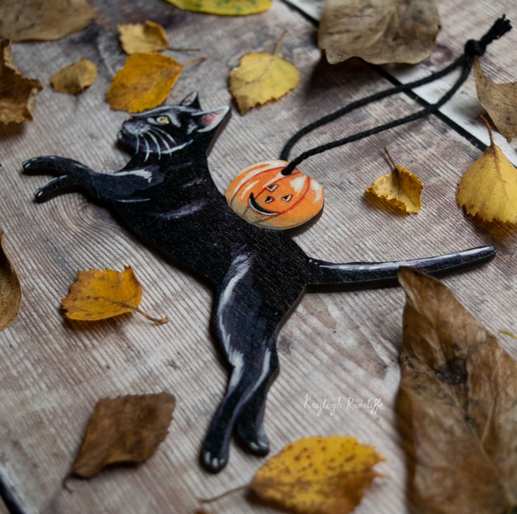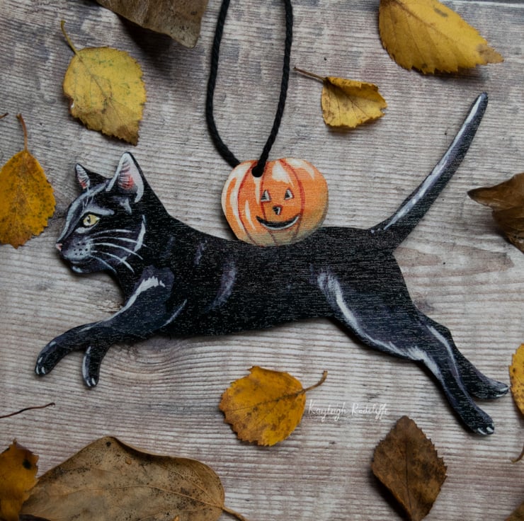 A charming vintage style laser cut wooden decoration of a leaping black cat with a pumpkin, purrrfect for this Halloween!