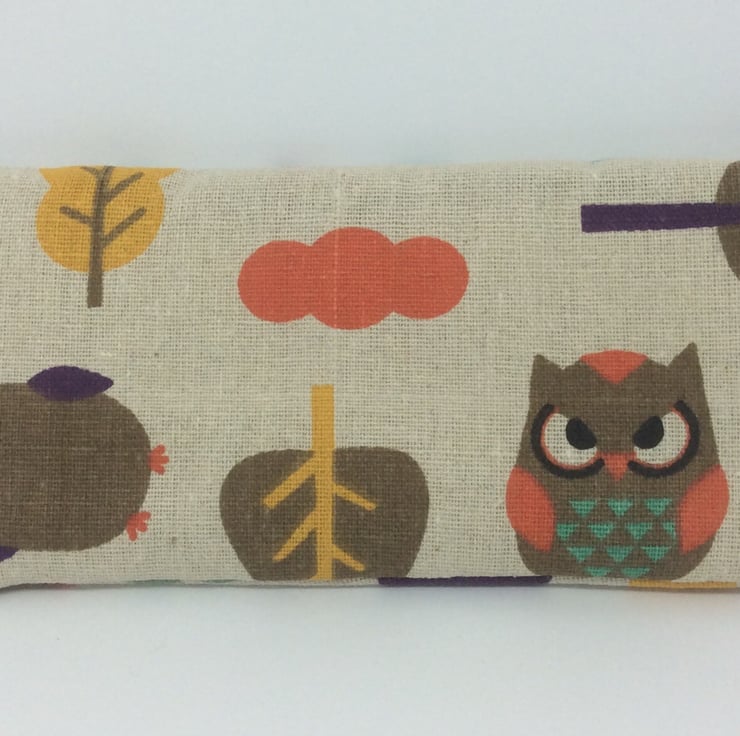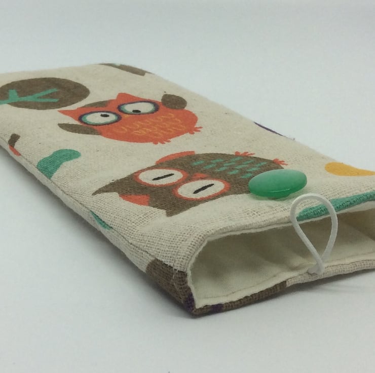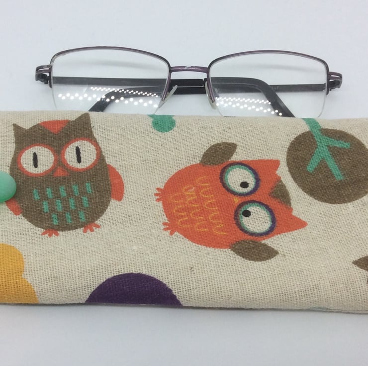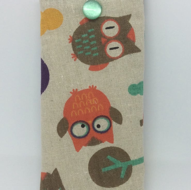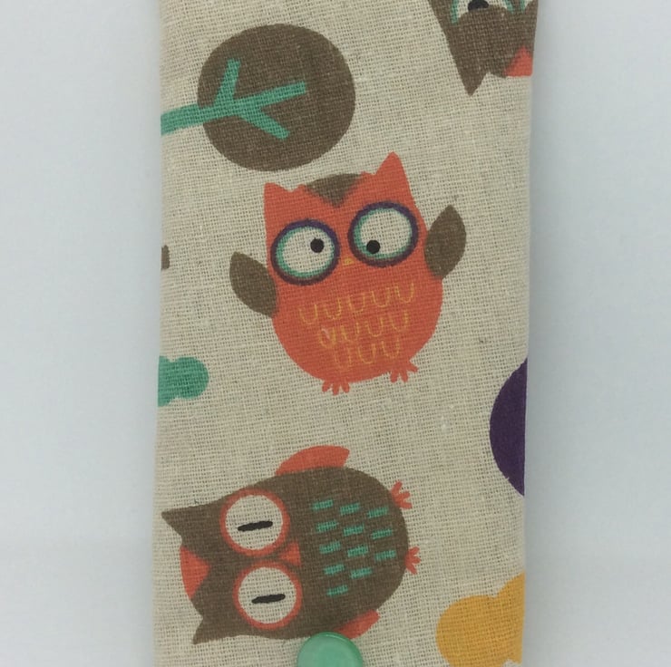 This sunglasses or glasses case has large owls and trees on both front and back printed on a linen style fabric. It has a cream cotton lining. The case is lightly padded and has a white elastic loop and matching pearly green button closure. The case measures approximately 17cm x 8.5cm.