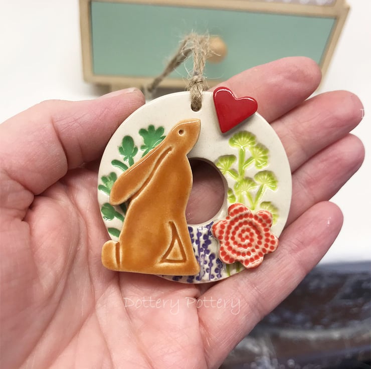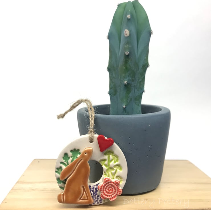This little pottery hare wreath decoration is made from white earthenware clay and glazed in a rich, glossy clear glaze. It has been fired twice. It measures 5.8cm diameter and hangs from a brown string Decorated on the front only.