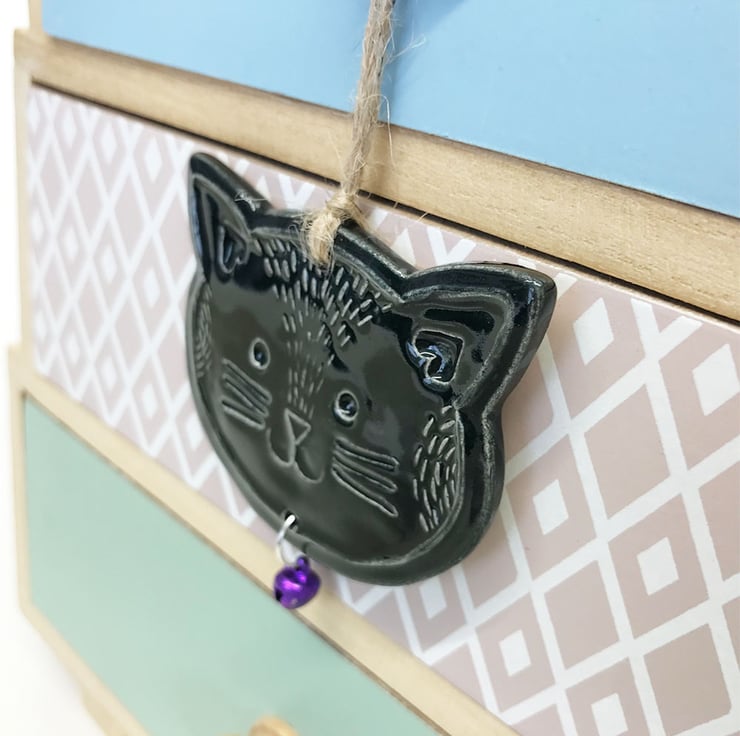 This cute little pottery cat been hand-cut and stamped from my own design. It is made from white earthenware clay, decorated and fired. It has then been glazed with a lovely glossy glaze and fired again to 1100 degrees. It hangs from a brown string. 7cm wide x 5.5cm high x 0.8cm deep.