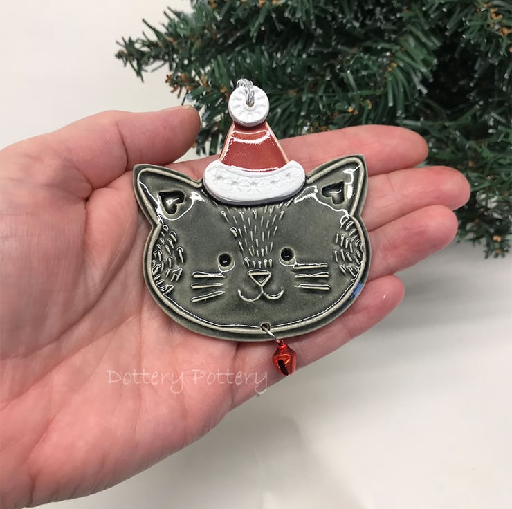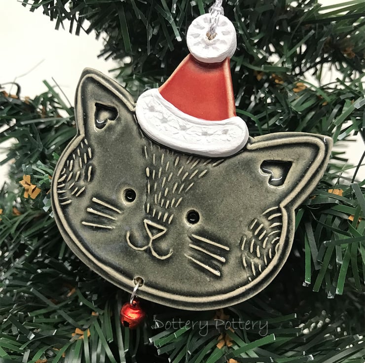This cute little pottery cat been hand-cut and stamped from my own design. It is made from white earthenware clay, decorated and fired. It has then been glazed with a lovely glossy glaze and fired again to 1100 degrees. It hangs from a silver string. 7cm wide x 7cm high x 1cm deep.