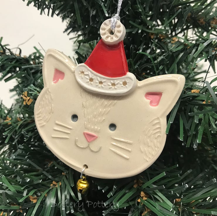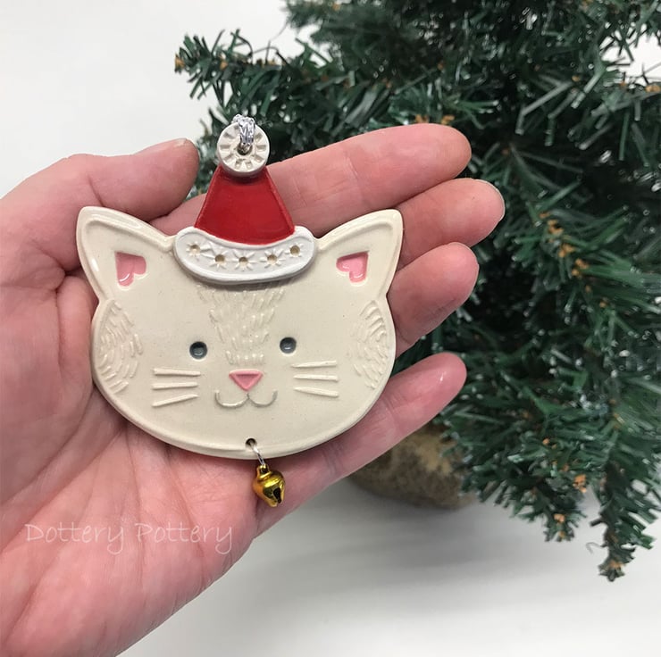 This cute little pottery cat been hand-cut and stamped from my own design. It is made from white earthenware clay, decorated and fired. It has then been glazed with a lovely glossy glaze and fired again to 1100 degrees. It hangs from a silver string. 7cm wide x 7cm high x 1cm deep.