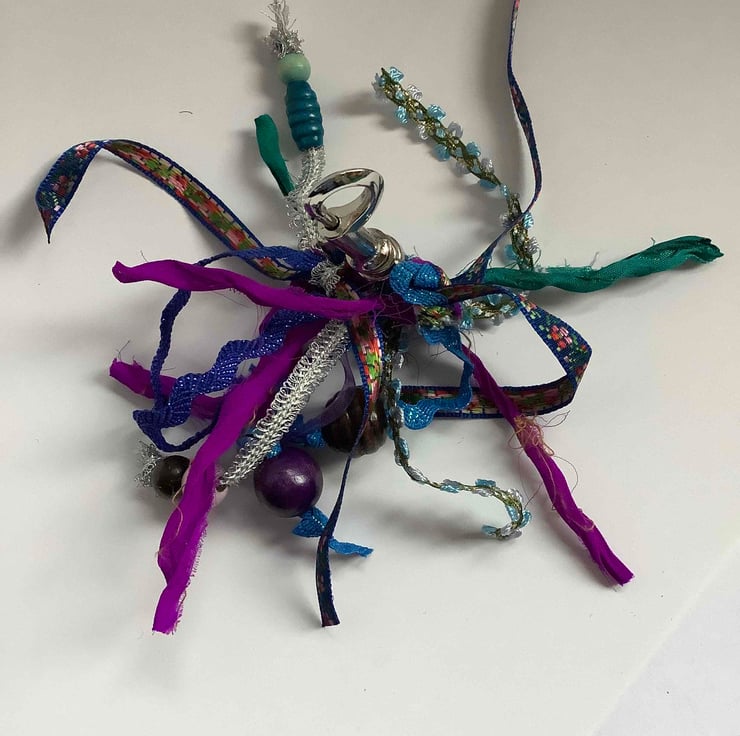 I have used some sari silk, organza ribbon, patterned ribbons, and various braids. Added to these are some wooden beads and some jingle bells but not too loud.