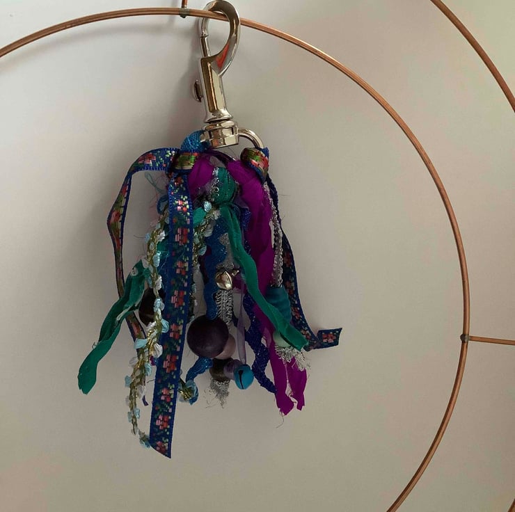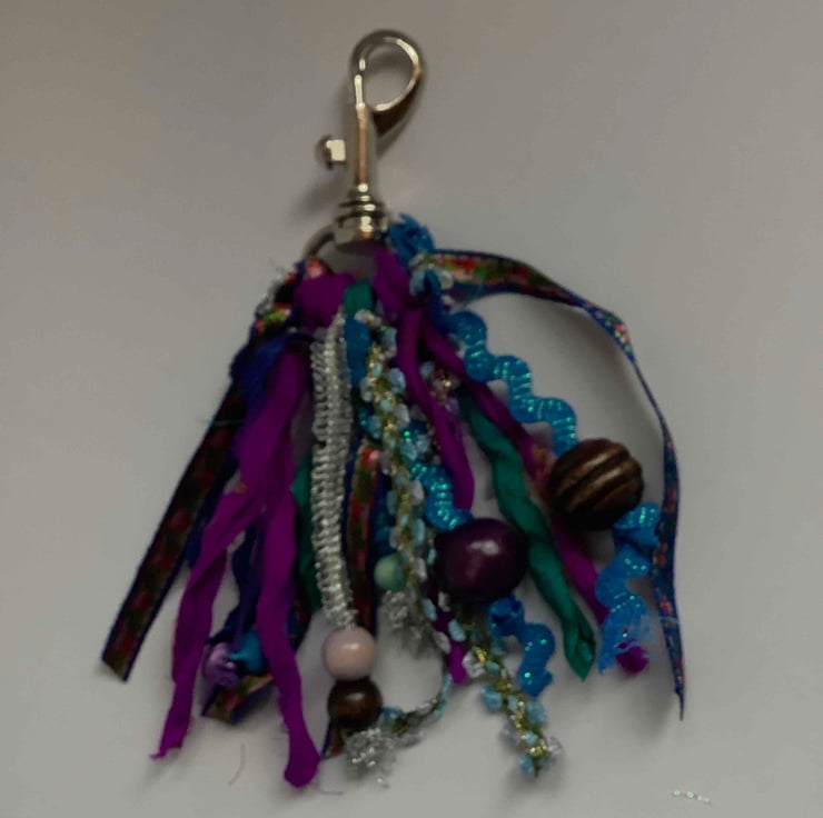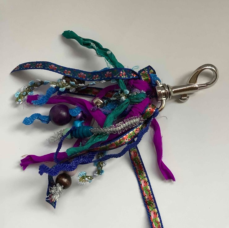 I just love a bag charm. In shades of purple, blues and teal this is an original one off gift.