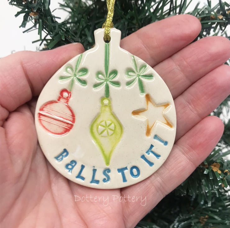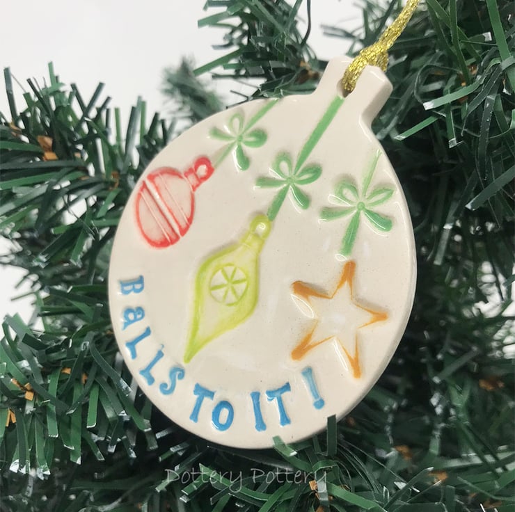 This pottery Christmas decoration is made from white earthenware clay and decorated with a bauble design. It has the words Balls to it on the front! This could be the perfect gift for someone that doesn't have much patience for the festive season! It measures 6cm x 7cm and hangs from a gold ribbon ribbon. It has been fired twice and finished with a rich, glossy glaze. Glazed to the front only.