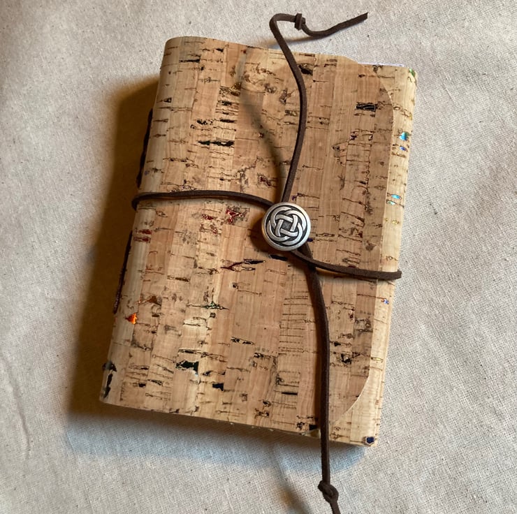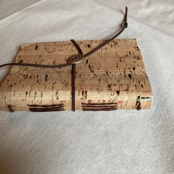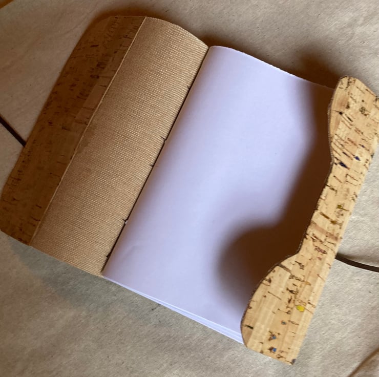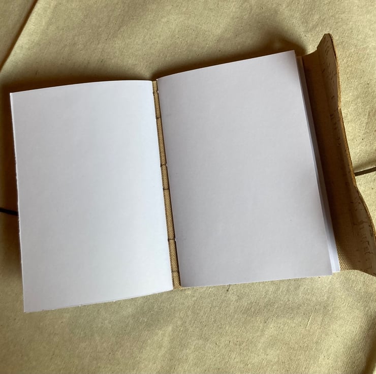 This wraparound notebook is covered in soft and flexible cork material - also known as vegan leather - and contains 128 pages of good quality plain white paper. The style of binding used here (long stitch) enables the pages to open wide and lie flat so it makes a good sketchbook. It measures 10.5 x 15 x 1.5cm.