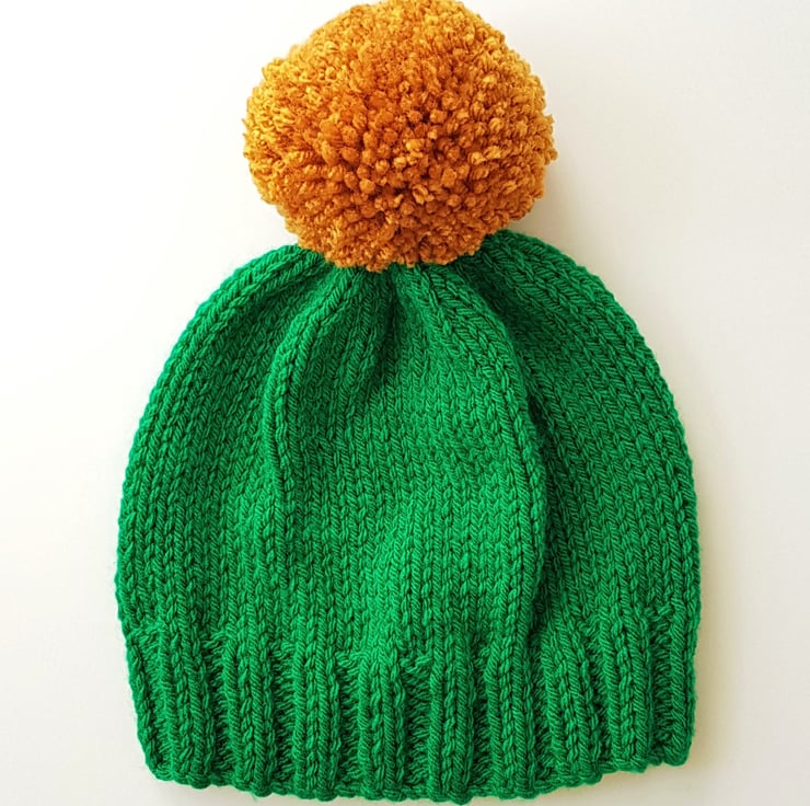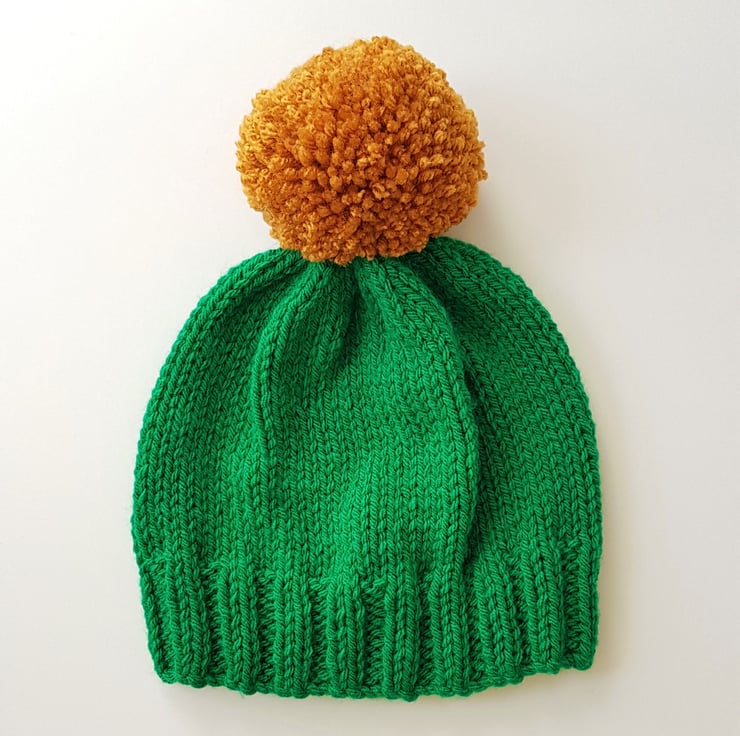 This bobble hat is hand knitted in emerald green chunky acrylic yarn with a large mustard chunky and squishy pom pom sewn on.