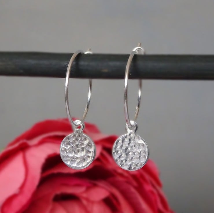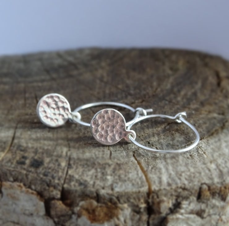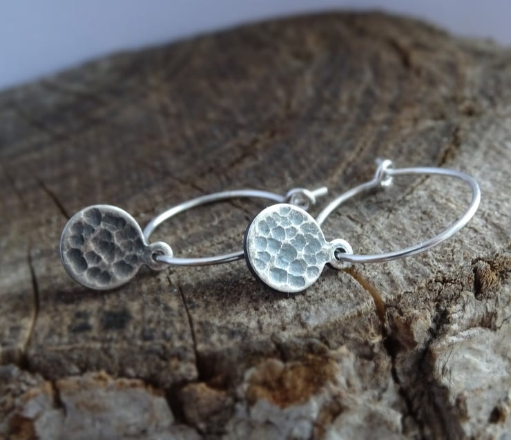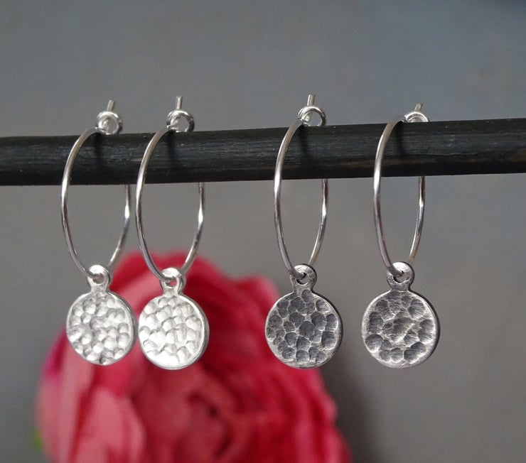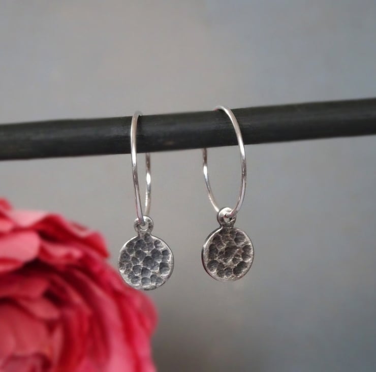 Cute minimalist sterling silver disc hoop earrings. The discs are hand hammered for a beautiful texture. The disc charms are partially oxidised and the hoops are silver. These simple and elegant earrings are perfect for any occasion or for gift giving. They are available in partially oxidised finish and silver finish. This listing is for one pair of earrings.