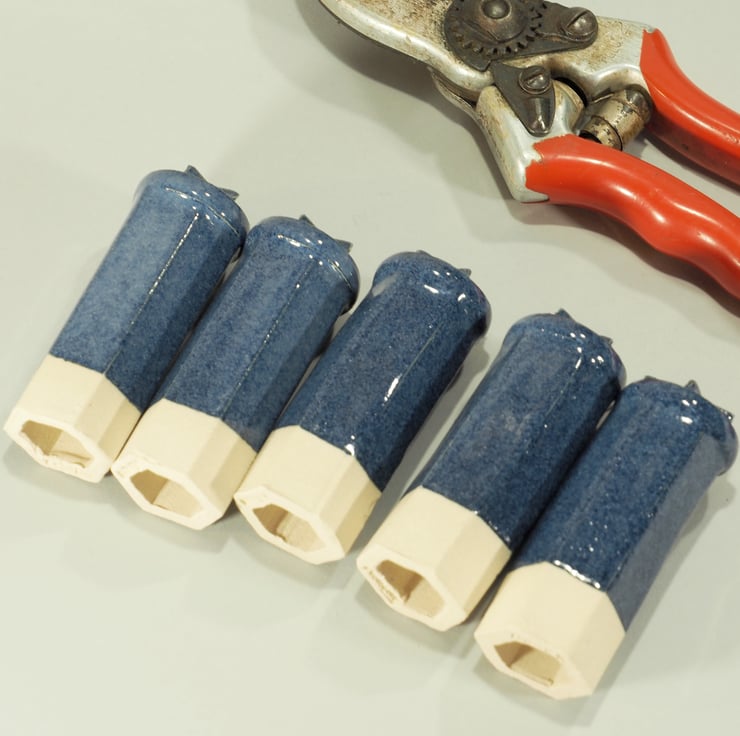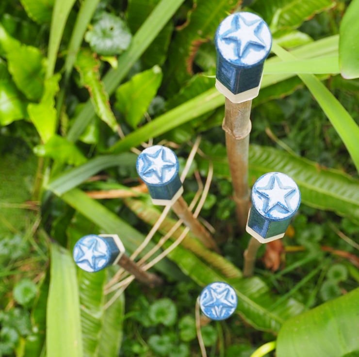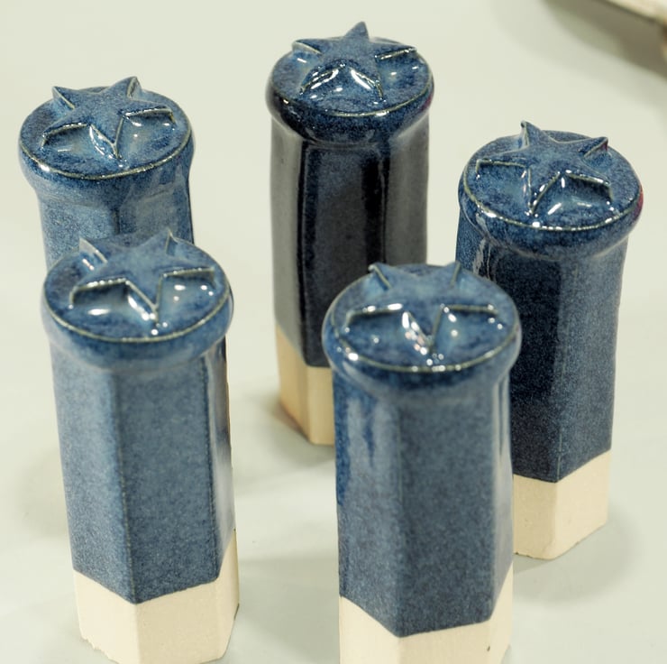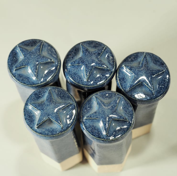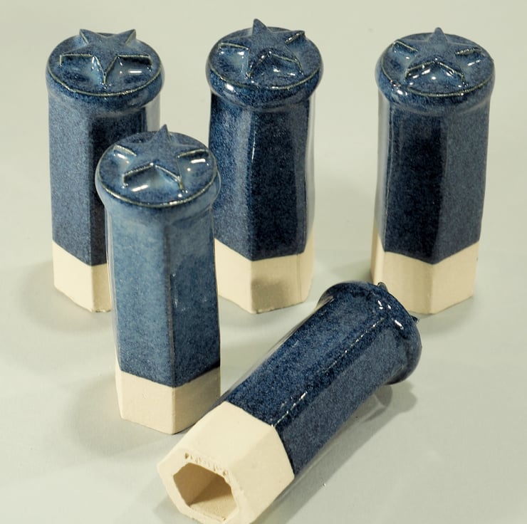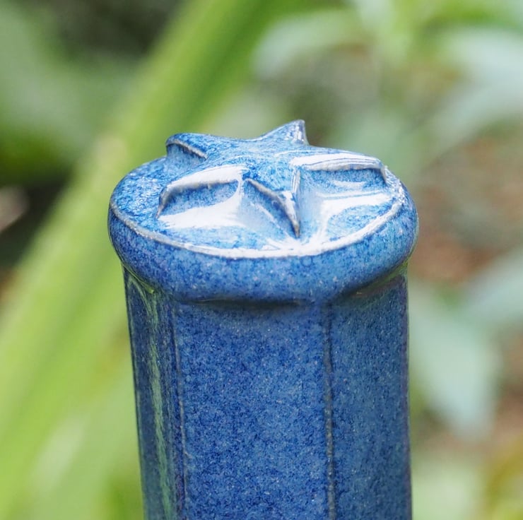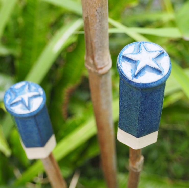 These are made from stoneware clay and fired to 1235degrees so they are frost proof and good for all weathers. Each topper is made from a hexagonal clay extrusion which is then finished with a disc and 5 pointed star, before glazing in a shiny blue glaze.