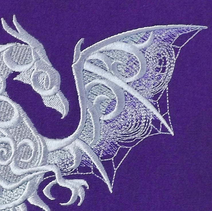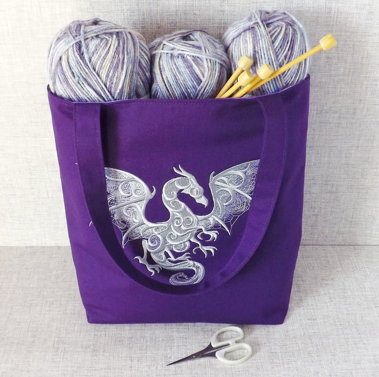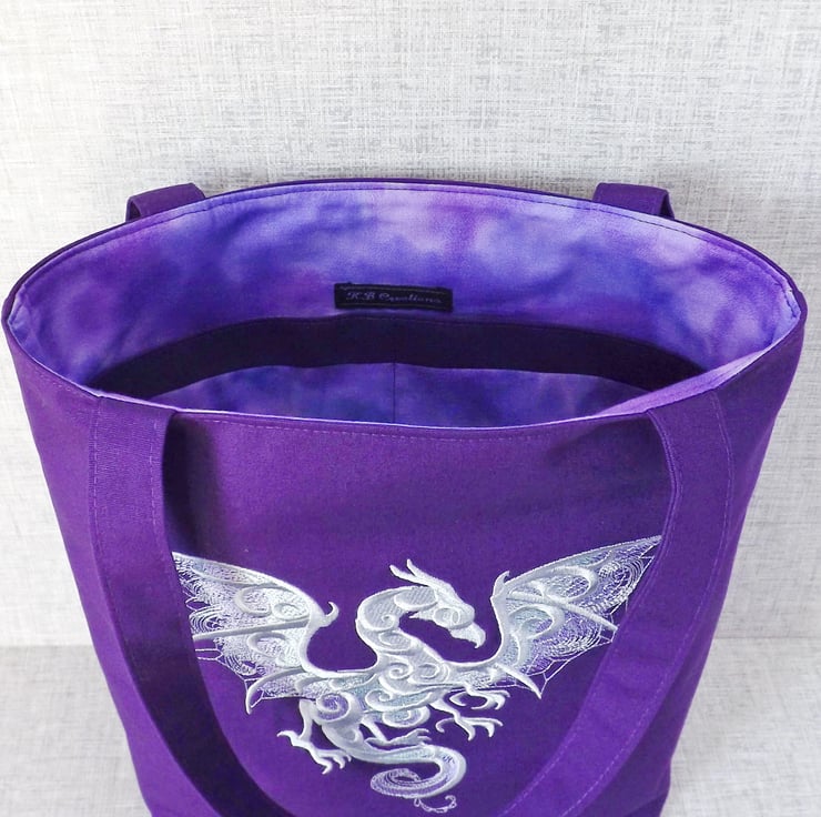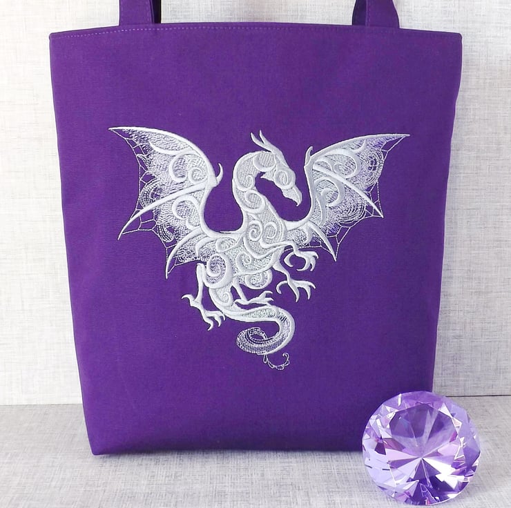 A medium sized strong tote bag made from purple cotton canvas fabric and embroidered with a dragon in shades of silver/grey, with lilac and mint green accents on the wings.