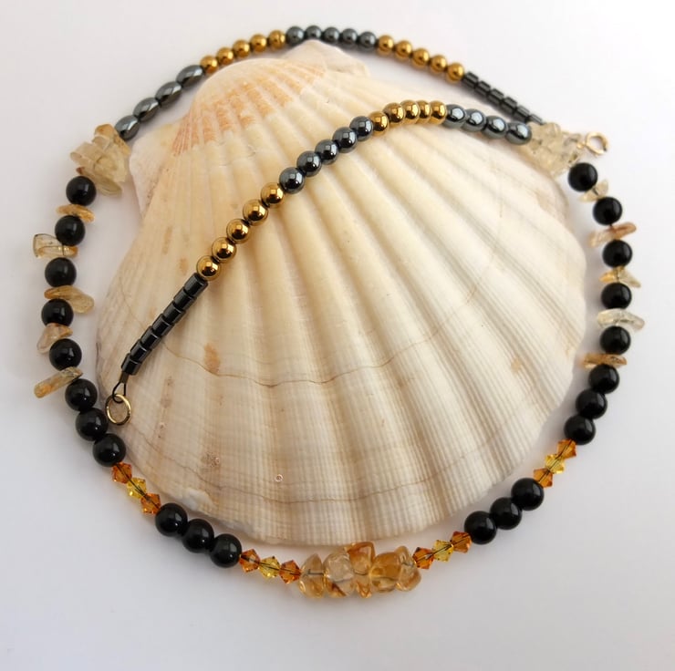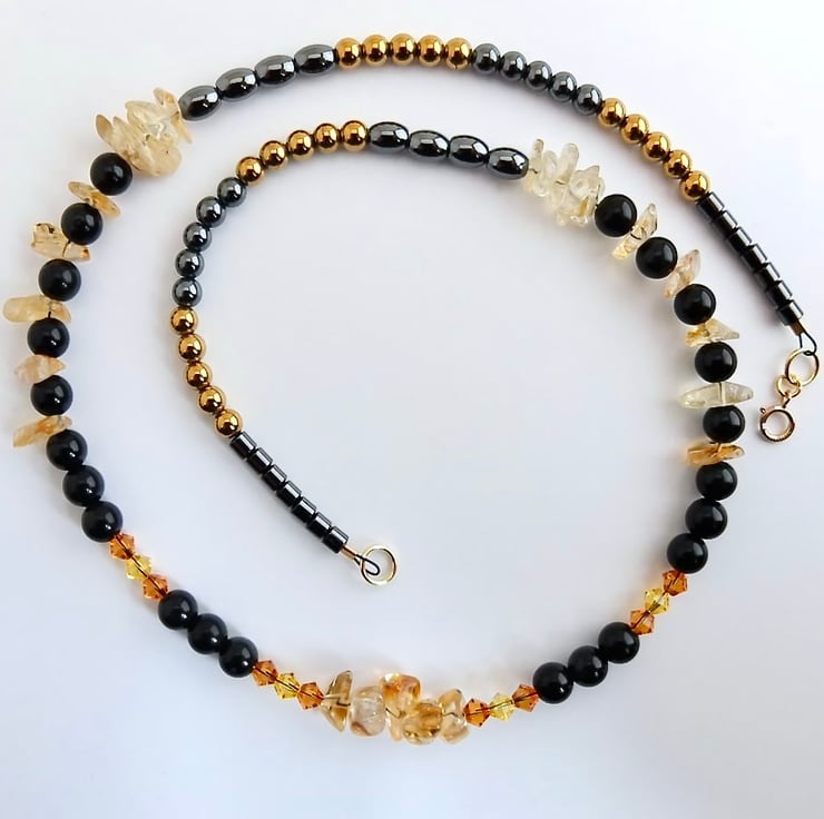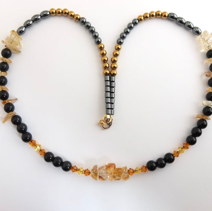The necklace then graduates to oval hematite, golden and traditional gunmetal hematite rounds and small barrel shaped hematite beads.