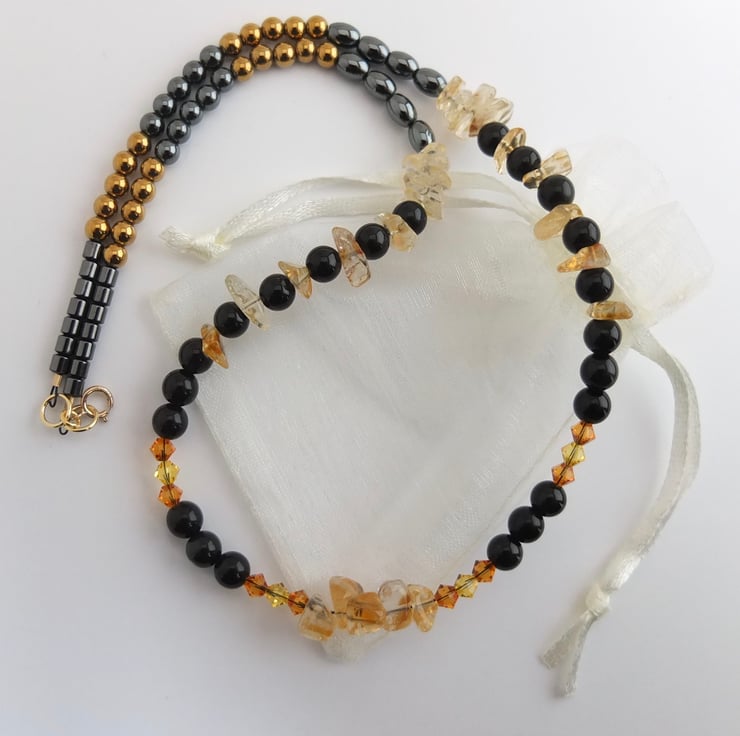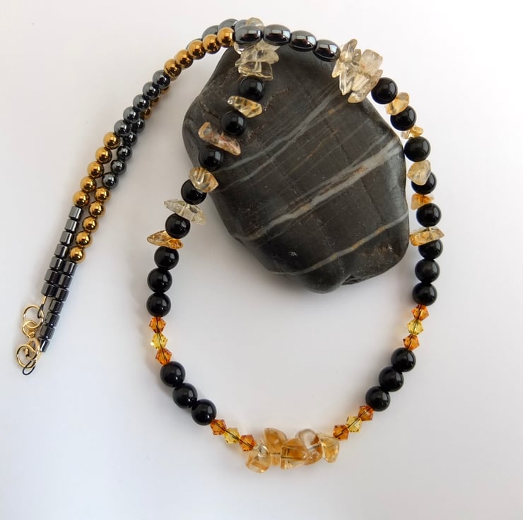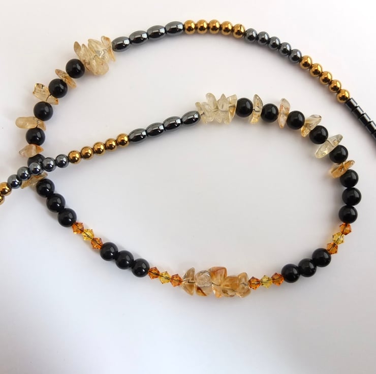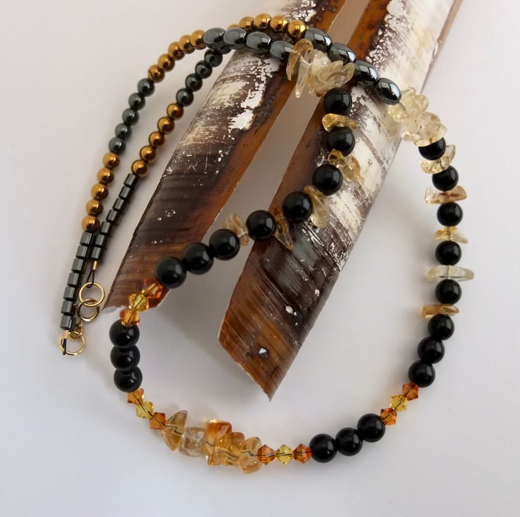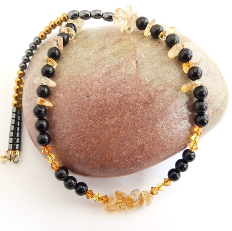 Translucent citrine chips and Swarovski crystals in the colours "topaz" and "light topaz" add flashes of colour, ranging from pale yellow to rich amber, between 6mm obsidian beads.