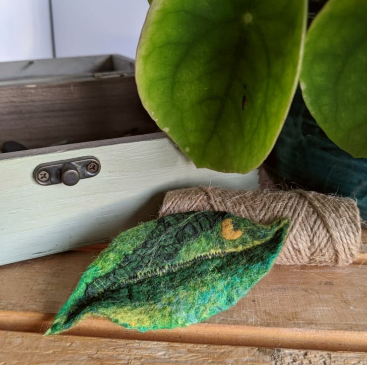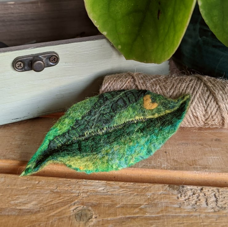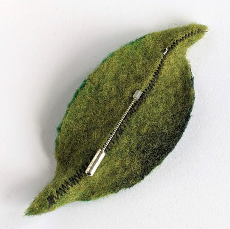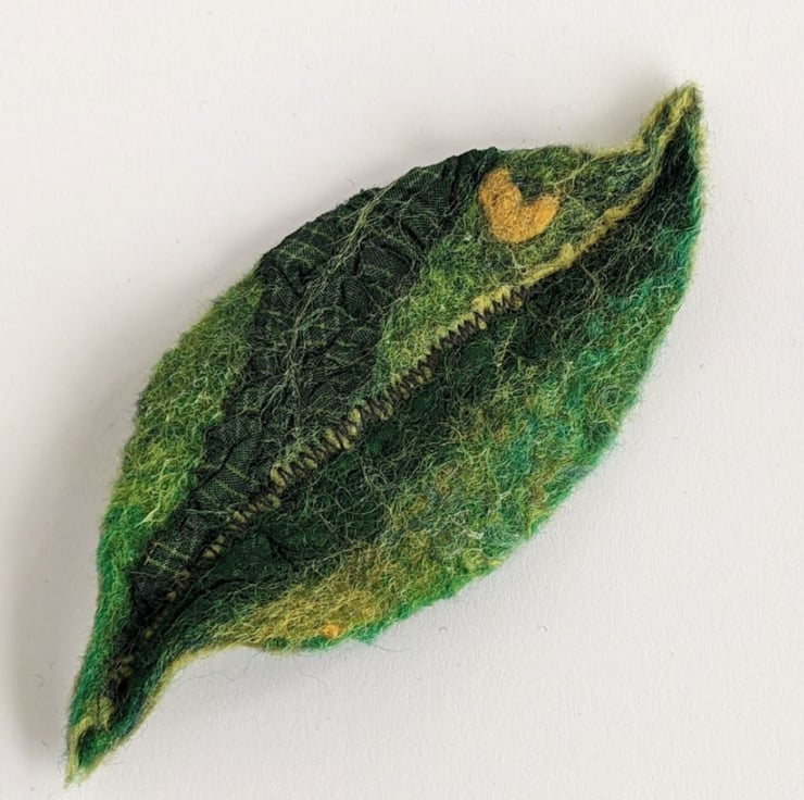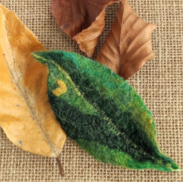 Felted leaf brooch handmade from soft merino wool in rich shades of green. It is embellished with silk ribbon and bamboo threads for subtle texture and shine, then lightly stiffened so that it retains its sculptural qualities.