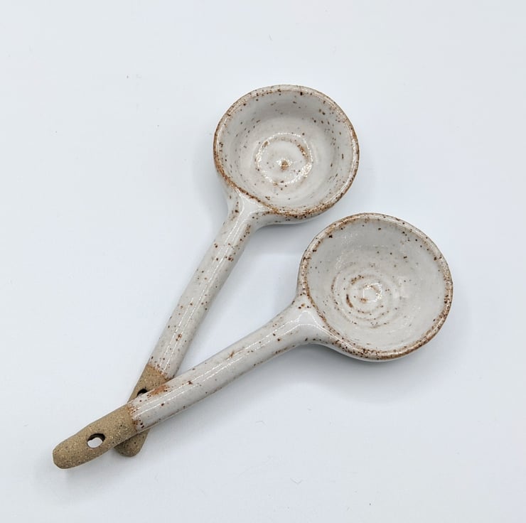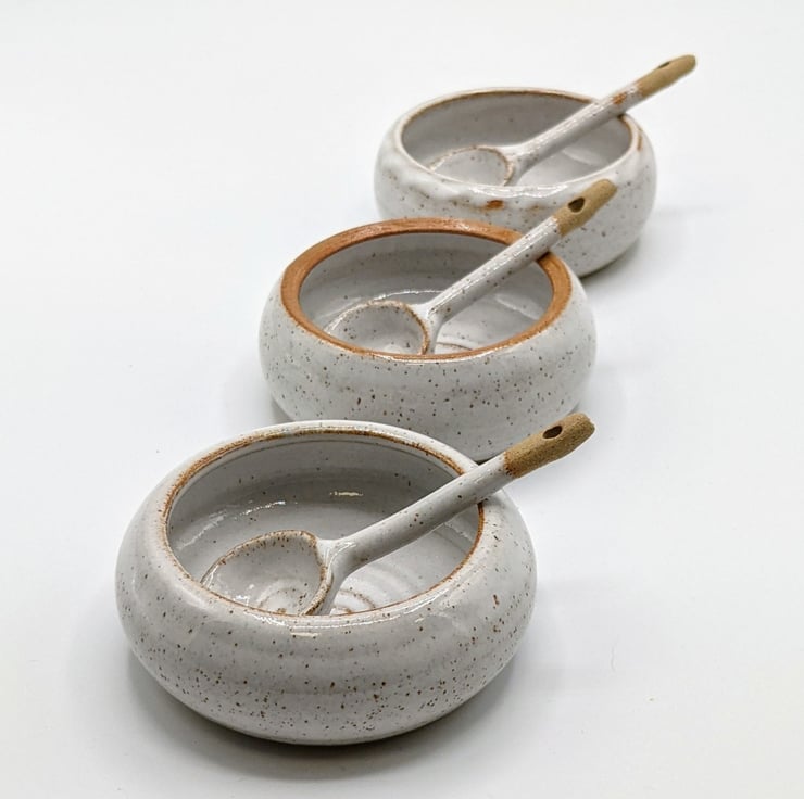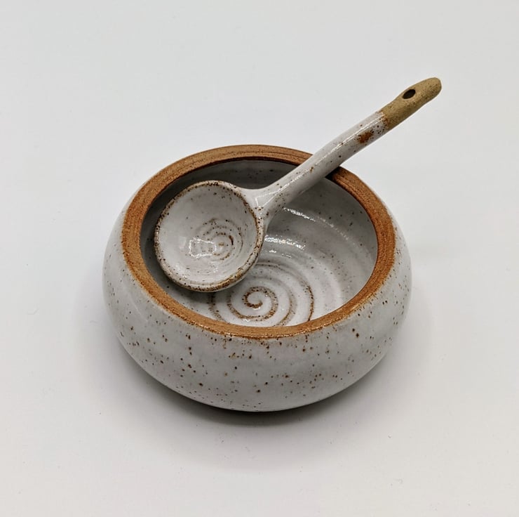 This little condiment dish and spoon were both made on the potter's wheel by Jane using a speckled stoneware clay. They are glazed in a food-safe glossy white glaze and the speckles from the clay burn through to give an attractive finish.