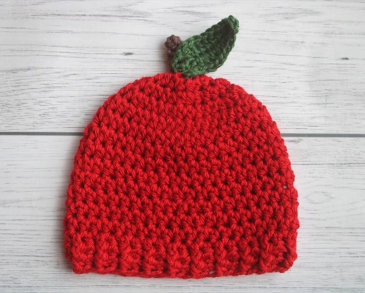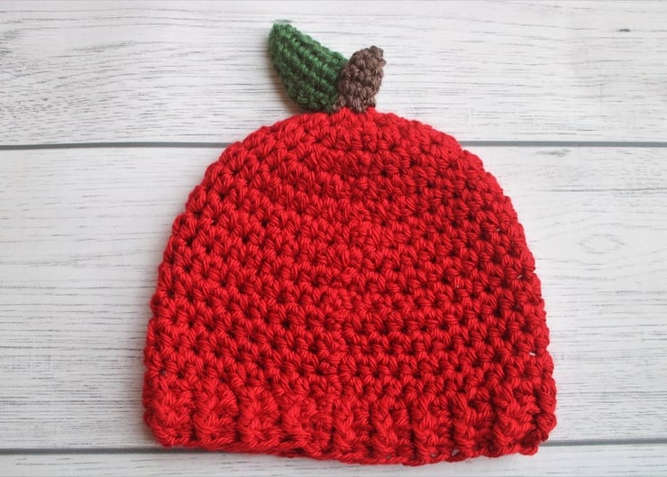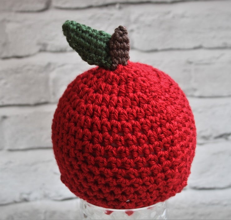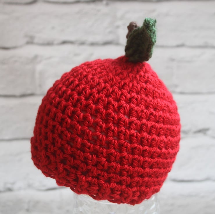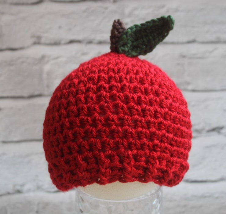 A crocheted apple beanie hat perfect for the cooler fall days.