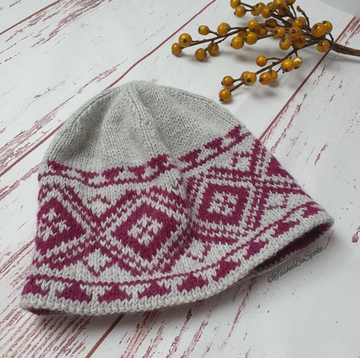 Very feminine and elegant, this hat is knitted in traditional Fair Isle pattern. I used high contrast light grey and purple yarn for stranded colorwork section. The turned hem gives a bit more protection from the cold and keeps the focus on beautiful colorwork pattern.