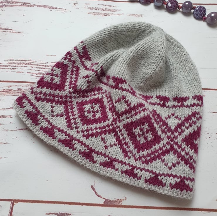 Very feminine and elegant, this hat is knitted in traditional Fair Isle pattern. I used high contrast light grey and purple yarn for stranded colorwork section. The turned hem gives a bit more protection from the cold and keeps the focus on beautiful colorwork pattern.