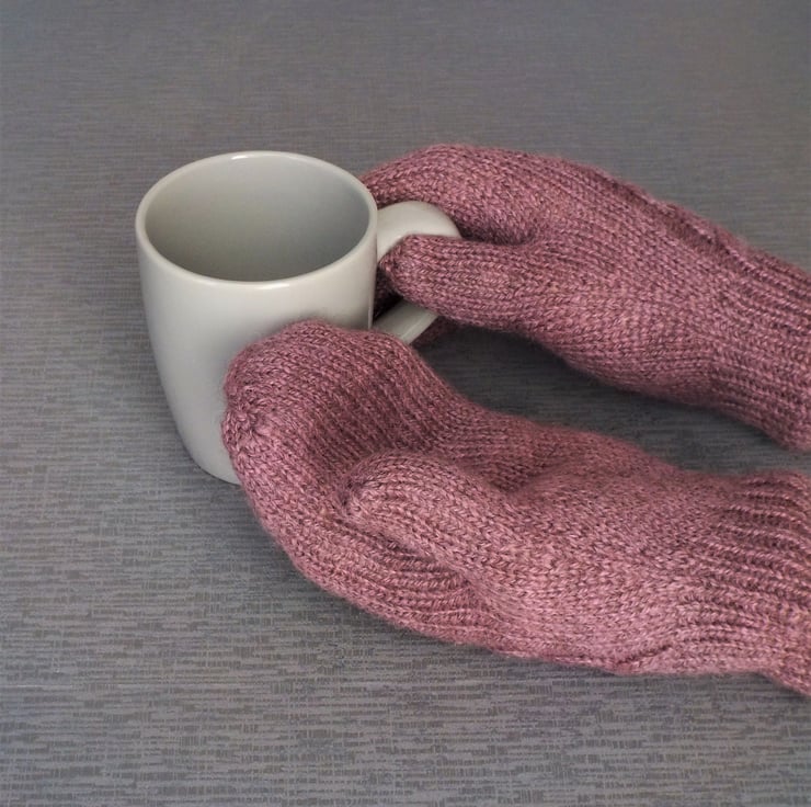 These stylish mittens are a lovely soft pink, slightly mottled with grey and plum. I have knitted these cosy mittens using British "dovestone" wool, a super soft blend of 50% Blue-faced Leicester, 25% Masham and 25% Wensleydale wools. As usual I have knitted them by hand using knitting needles, not a machine. They are knitted "in the round" so no ugly or uncomfortable seams up the edges.