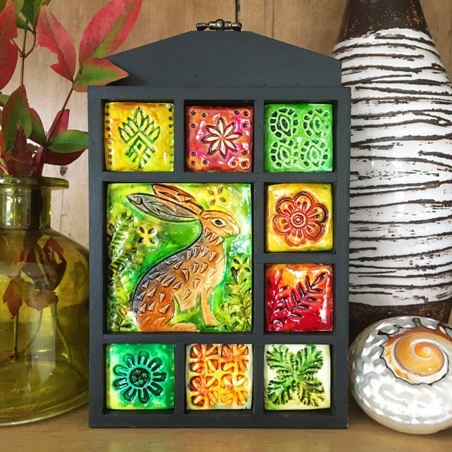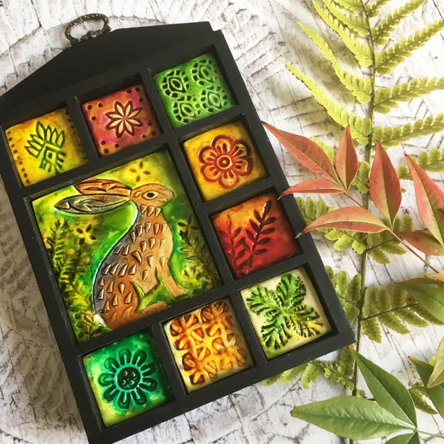 The artwork is housed in a vintage wooden thimble rack which has been given a coat of black acrylic paint. Polymer clay tiles have been made to fit each compartment and debossed with a range of patterns and designs. I've used layers of glass paint in rich Autumnal hues to add colour and lustre.
