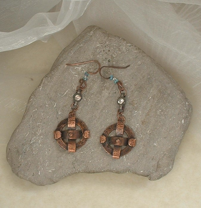 Created using strips of copper crossed and wrapped round a textured copper washer and held together with a copper wire rivet. Small diamante beads add a touch of sparkle and they have handmade copper ear wires with tiny glass seed beads. Finished with a rich antique patina sealed with a silicon wax polish.