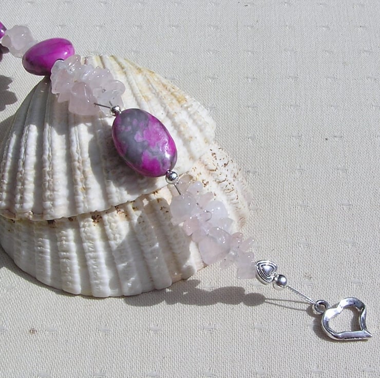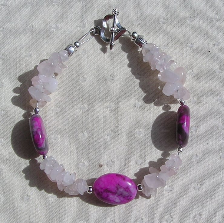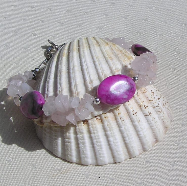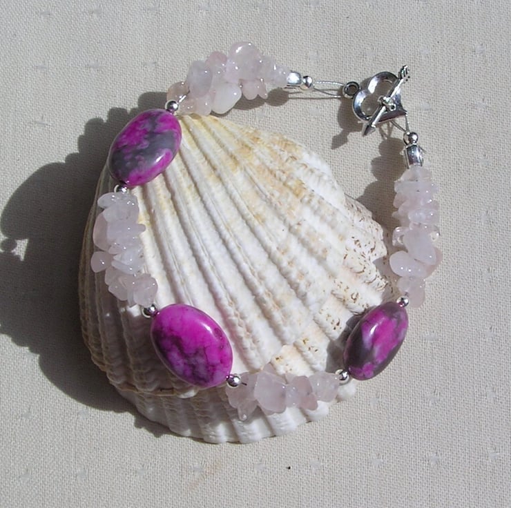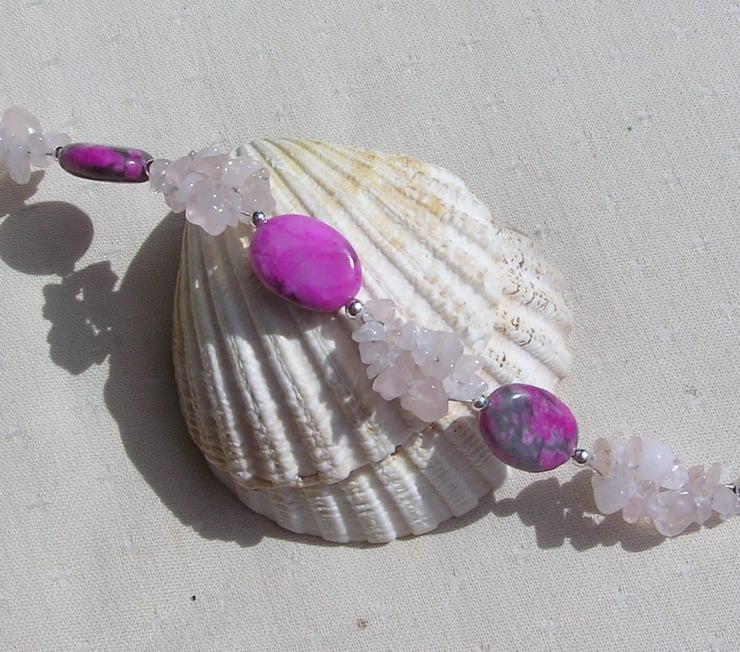 This Stunning Bracelet is made from three Pink Rhodonite Oval Beads separated by double stranded Rose Quartz Gem Chips - a Beautiful glistening combination that will look stunning either worn casually or with something more Elegant for a Special Evening out