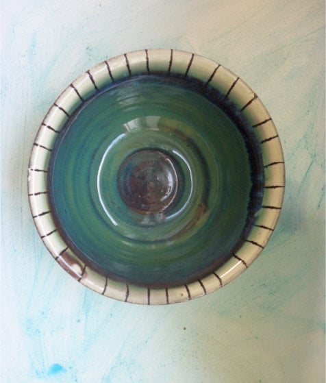 - Decorative Sgraffito design on the rim, a blue white glaze on the outside and a green glaze on the inside.
