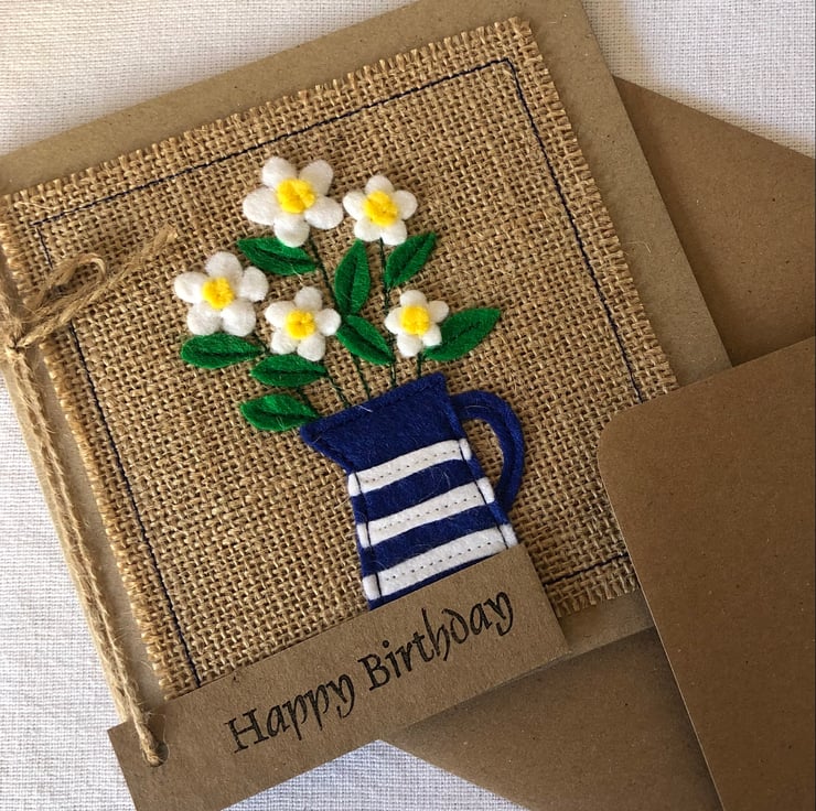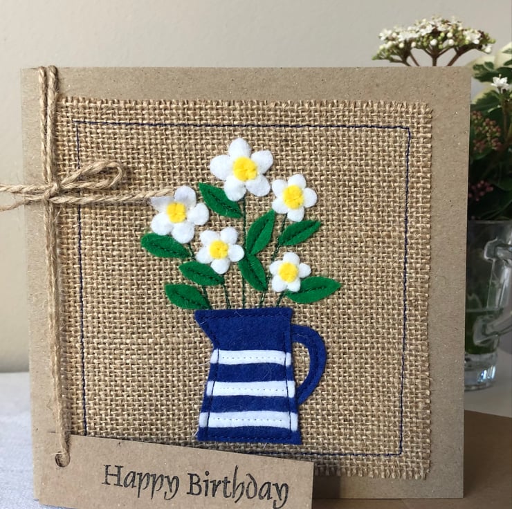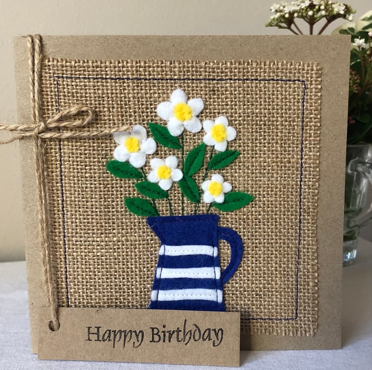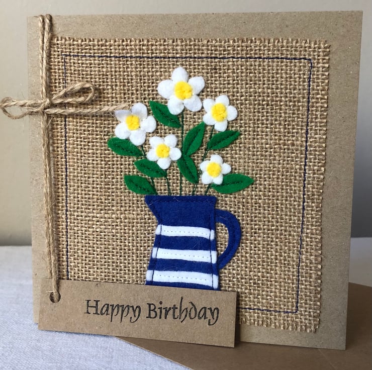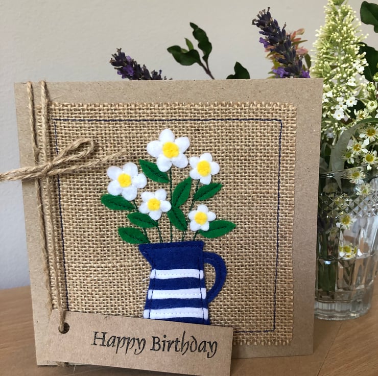 This card is decorated with white daisies in a blue striped jug.