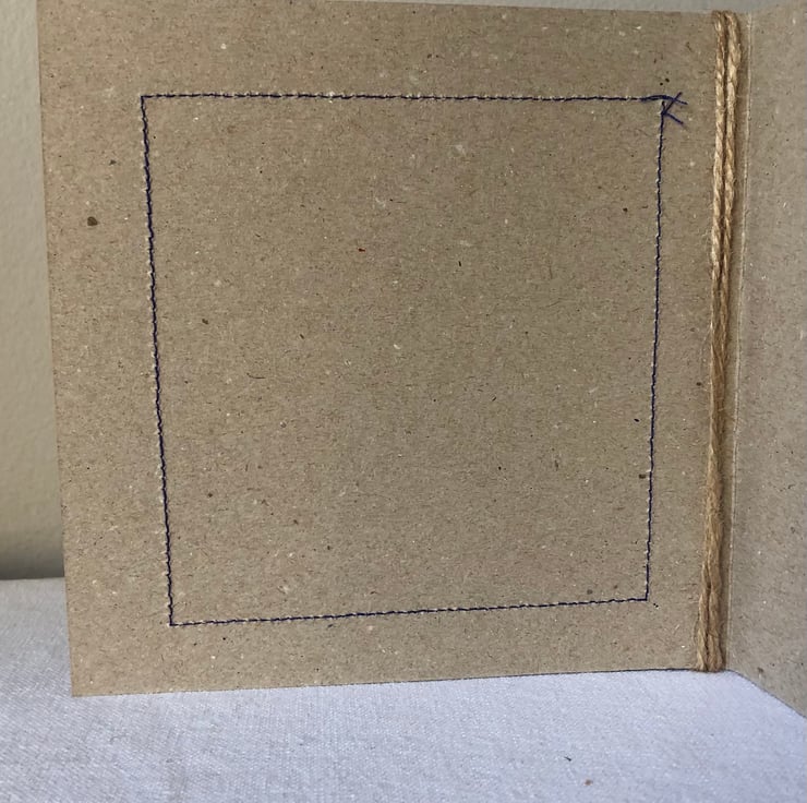 The hessian is machine stitched , using a contrasting thread, to a plain brown card. This stitching is visible on the inside of the card.