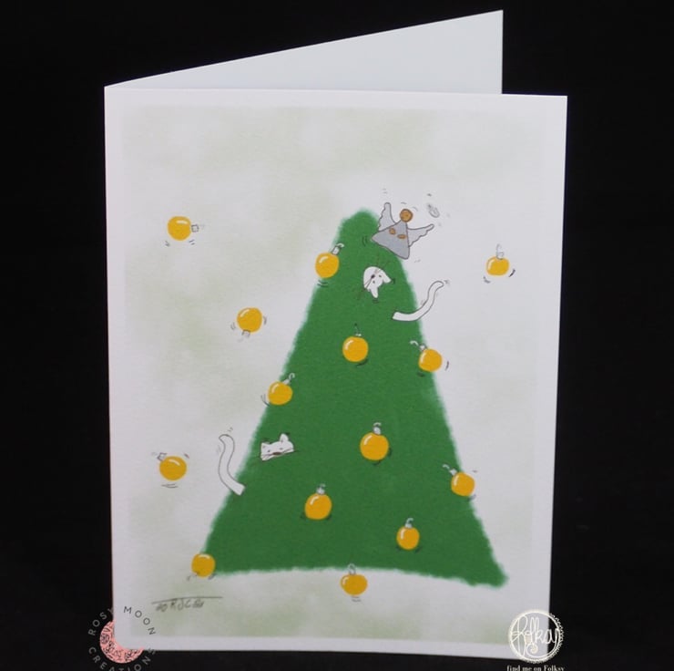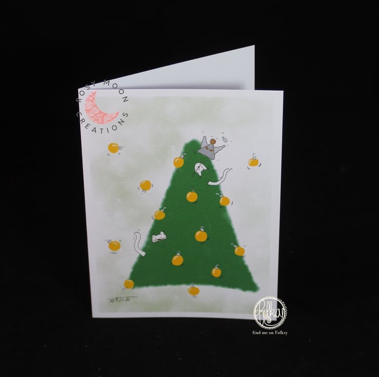 The naughty cats range of cards make me smile as I create them. These cheeky rascals are rearranging the Christmas baubles because they know the tree will look better once they are finished with them. The poor Angel has been knocked from the top of the tree and is looking slightly concerned.
