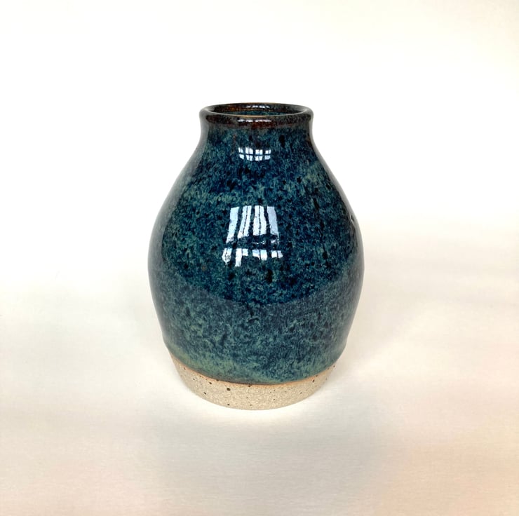 Hand thrown stoneware vase, glazed in flecked blue. Base diameter: 6.5cm.