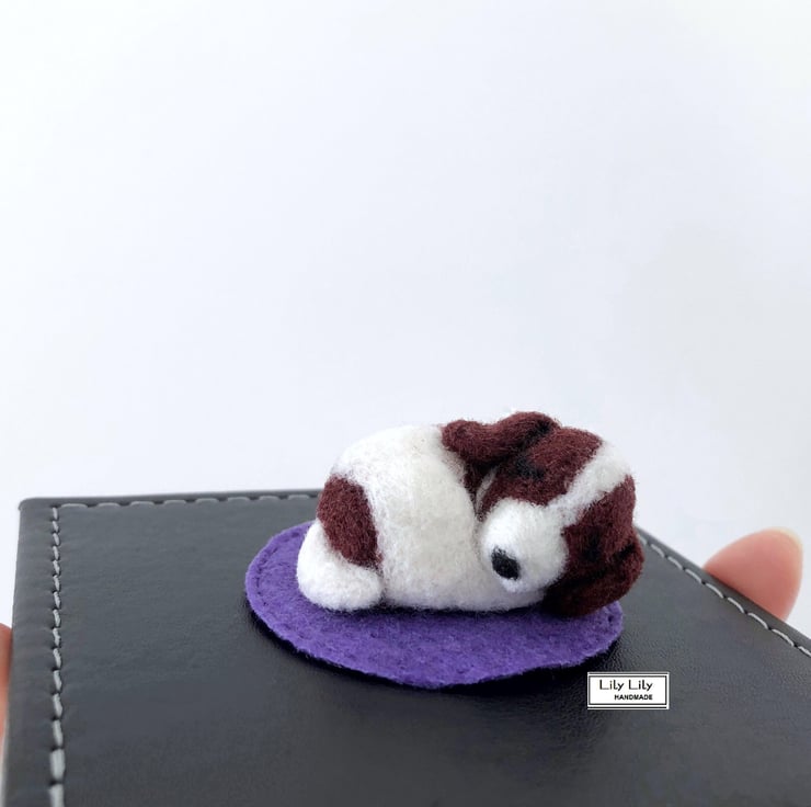 A cute miniature puppy dog needle felted by Lily Lily Handmade. A one of a kind collectable, perfect as a ornament or lucky mascot. The Jack Russell puppy dog, called Coco, is a sleepy little dog who is looking for her forever home. She comes with her own favourite cosy round purple rug.