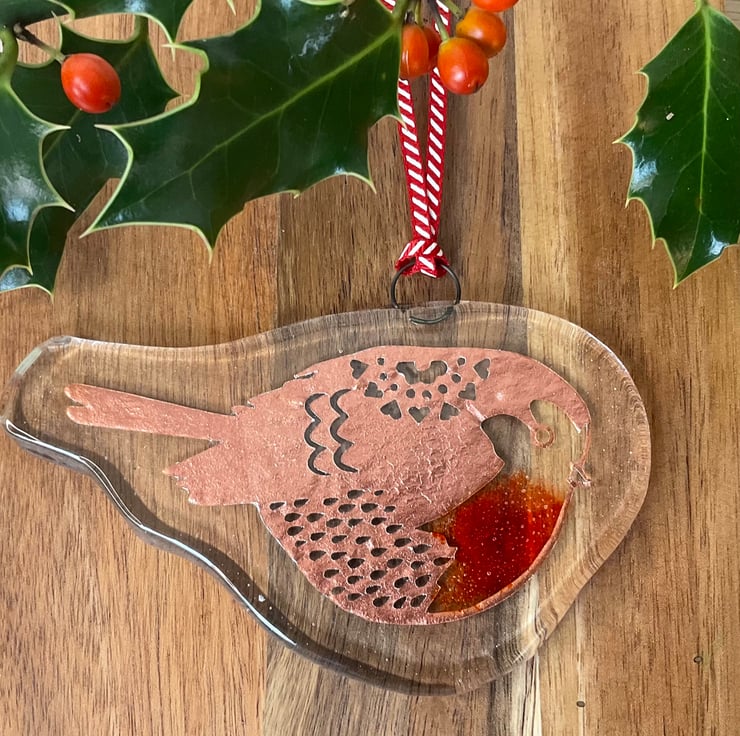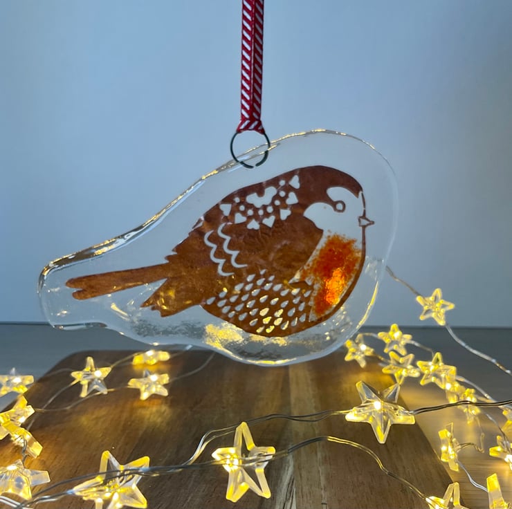 This fused glass red robin is handmade and makes a beautiful Christmas tree decoration. It is hand cut from bullseye art glass with a metallic bronze decorative robin and bright red glass to make its red breast. Each robin has a metal hanging ring and ribbon for easy hanging.