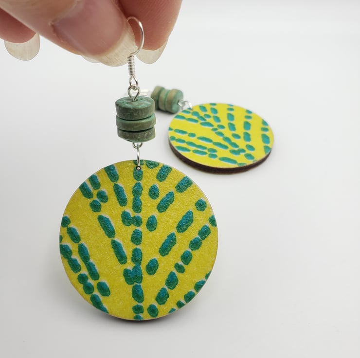 These very pretty sunshine yellow and green earrings are lovely and light to wear, the birch disc measures 4cm across. The flat green beads have been repurposed and work well with the modern green line design. To finish them off I've used sterling silver hooks.