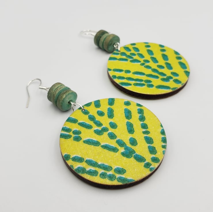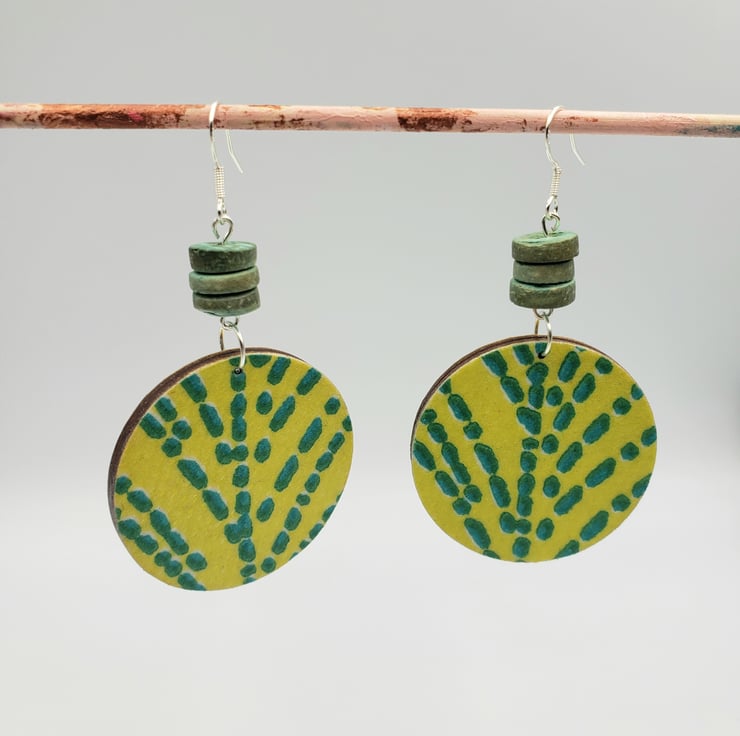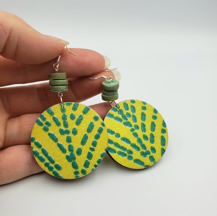 These very pretty sunshine yellow and green earrings are lovely and light to wear, the birch disc measures 4cm across. The flat green beads have been repurposed and work well with the modern green line design. To finish them off I've used sterling silver hooks.