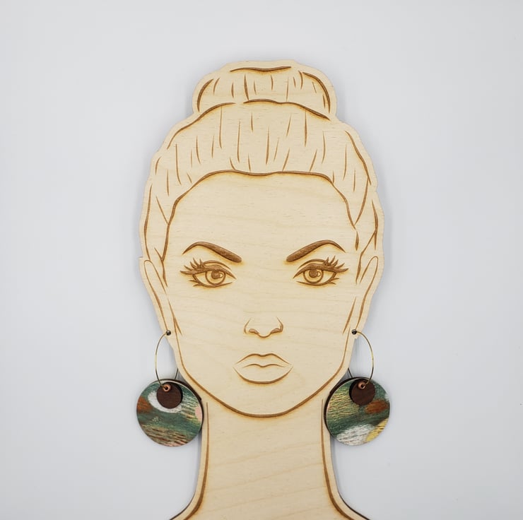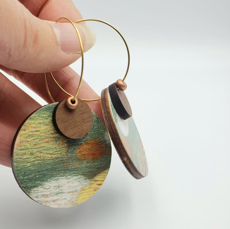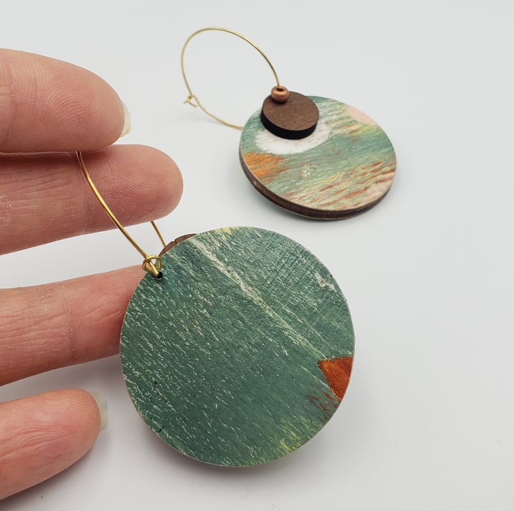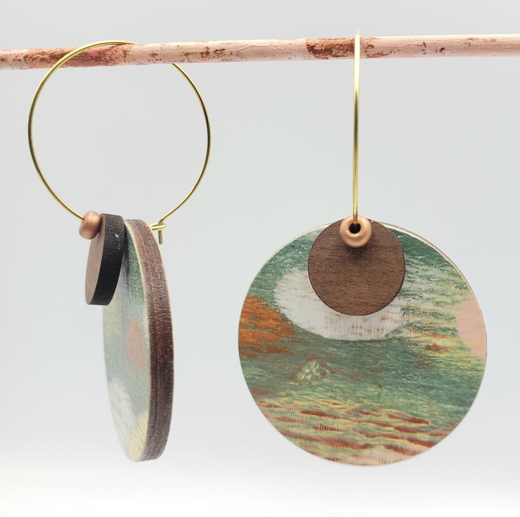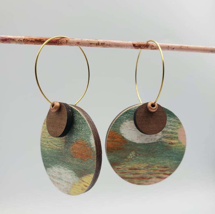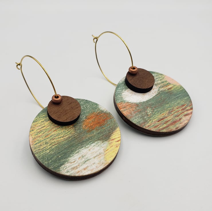 Autumnal coloured dangly earrings with gold plated hoops and small walnut discs. These sweet earrings are easy to wear day or night and are also light, weighing only 4g each. The design was hand printed onto paper then decoupaged onto birch discs and protected with varnish.