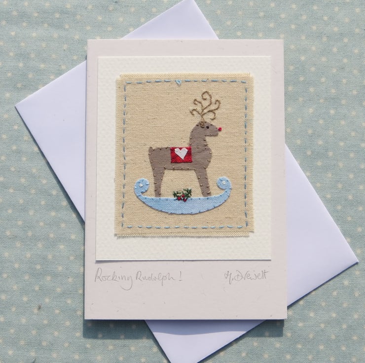 This is a small handmade greeting card featuring a miniature hand-stitched applique 'rocking Rudolph' with intricately embroidered details. (He has a red nose of course!)