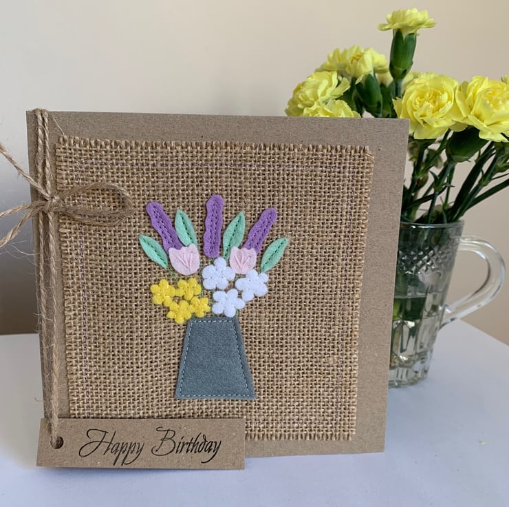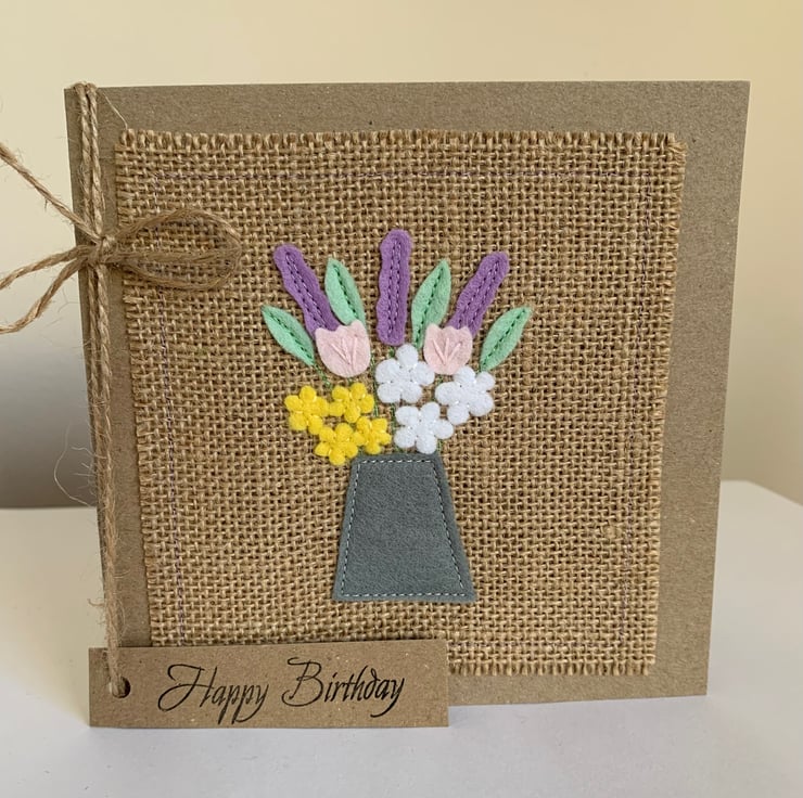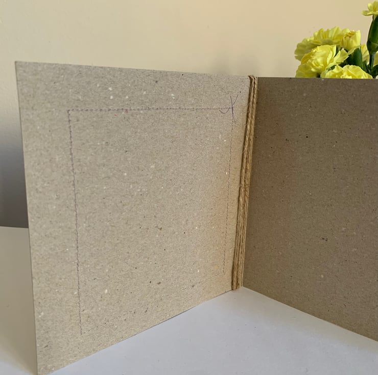 The hessian is machine stitched, using a contrasting thread, to a plain brown recycled card. This stitching is visible on the inside of the card.