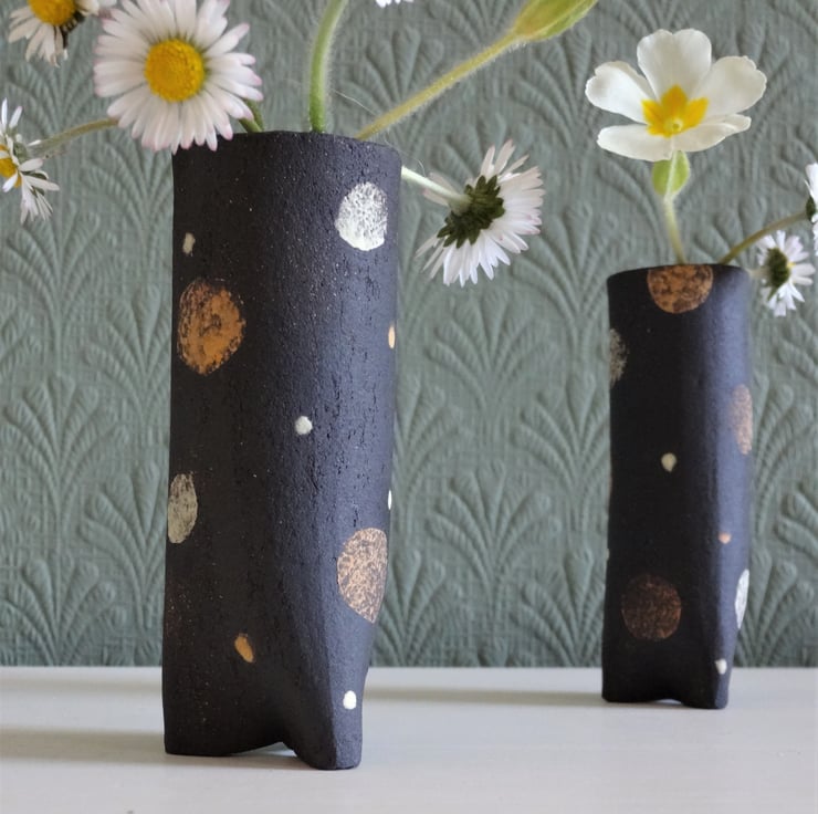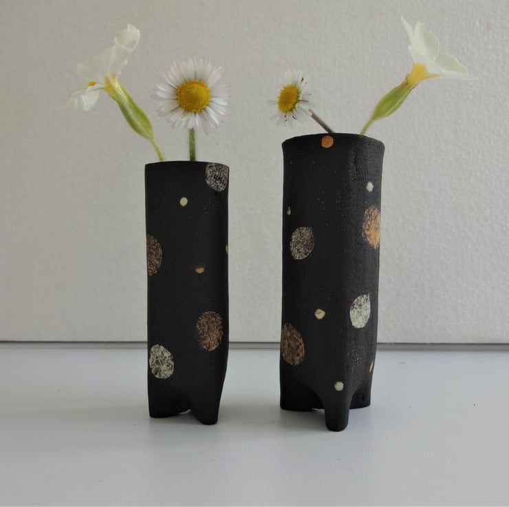 These little non-identical twins make a lovely set of informal vases for showing off a single bud or small flower posy, perhaps in a bedroom for a special guest or as a pretty addition to a breakfast-in-bed tray. I hand made them from black stoneware clay, forming three little feet at the bottom by pinching in the clay. Inside they are glazed a russet brown to hold water, or you can use them for pens and pencils. The outside is the natural matt finish of the black stoneware clay, and I have used spots and dots in cheery yellow and white before firing to 1185 degrees C. The larger of the two is 9cms high and 3.5 cms across, and the smaller is 8cms high and 2.5 cms across. Price is for the pair.