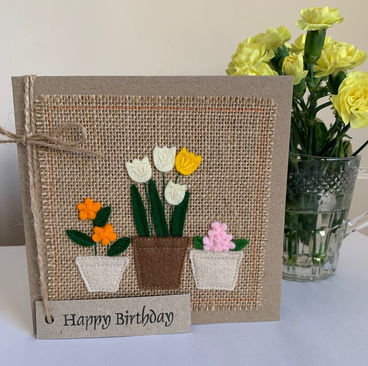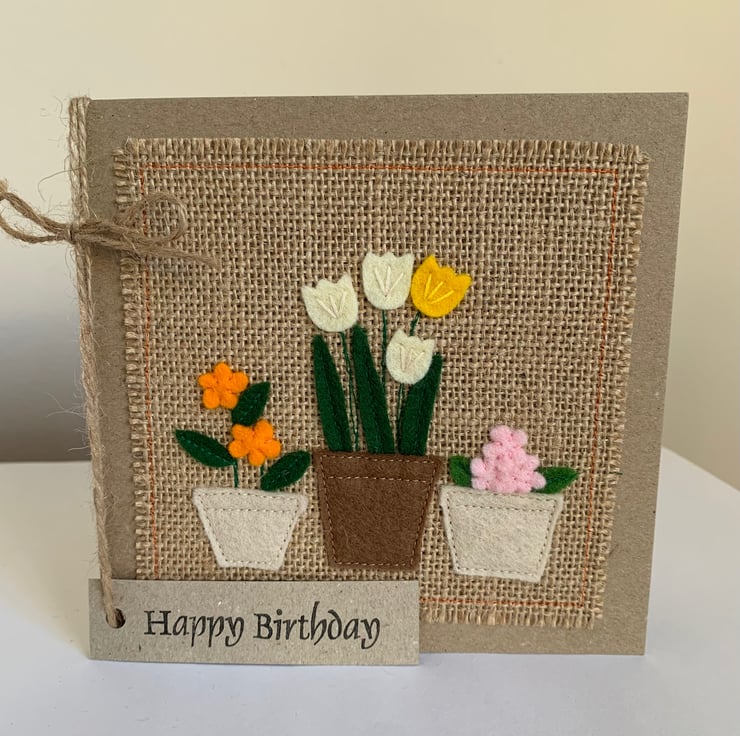 This greeting card is decorated with a row of three pots of colourful flowers.